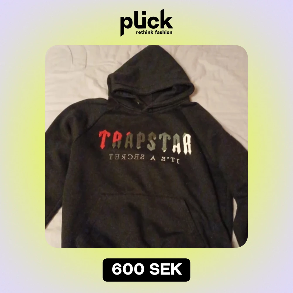 Säljer en svart hoodie från Trapstar med texten 'It's a Secret' i rött, vitt och grått på framsidan. Den har en stor ficka fram och en mysig huva. Perfekt för en chill dag eller en cool streetwear-look!