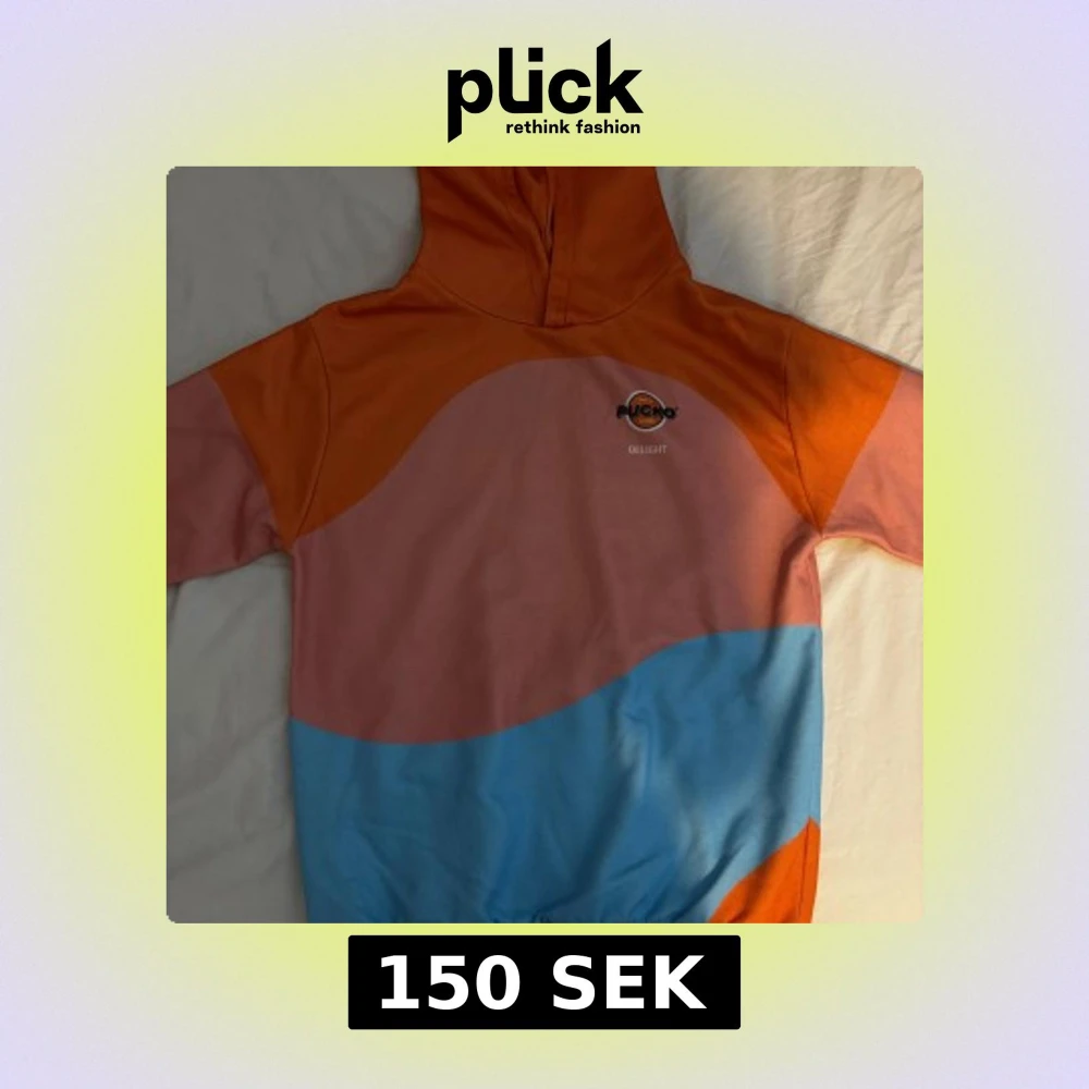Färgglad hoodie från PUCKO med vågiga block i orange, rosa och blått. Tryck med PUCKO-logga och texten 'GOOD MOOD MOMENTS' på ryggen. Hoodien har huva och är tillverkad i mjuk bomullsmix. Perfekt för dig som gillar unika och lekfulla plagg.