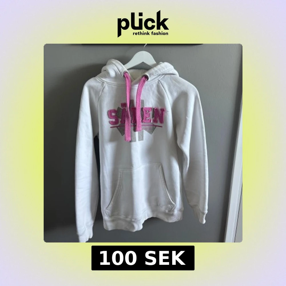 Vit hoodie med rosa detaljer och broderad text 'Sälen' framtill. Stora rosa snören i huvan och en praktisk magficka. Mjuk insida och klassisk passform, perfekt för chill dagar. Snygg logga på huvan och coolt tryck i silver och rosa.