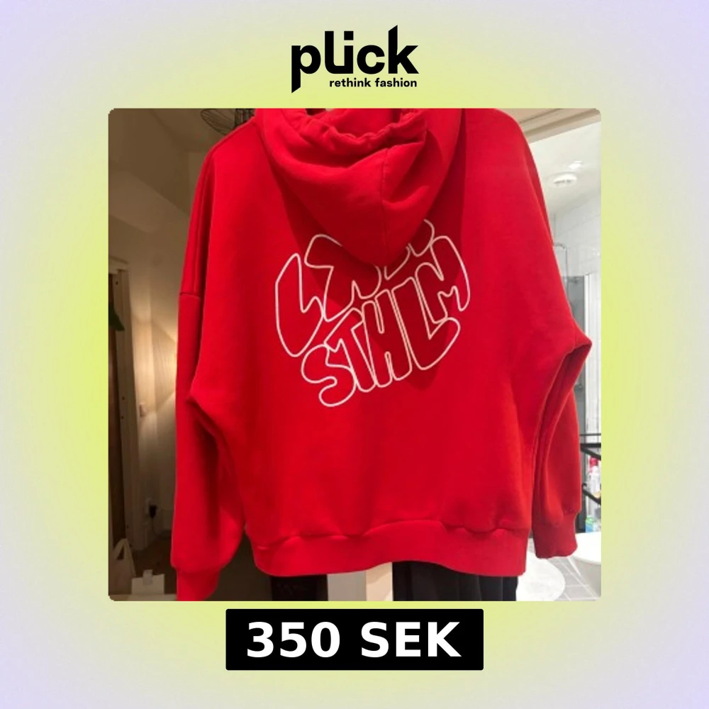 Säljer en röd hoodie med stor vit text på ryggen. Tröjan har huva och en avslappnad passform, perfekt för en streetwear-look. Från lxa