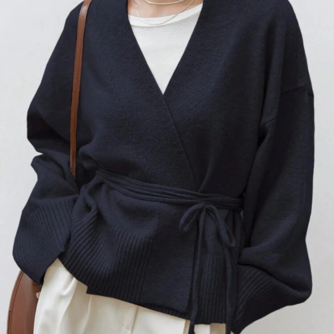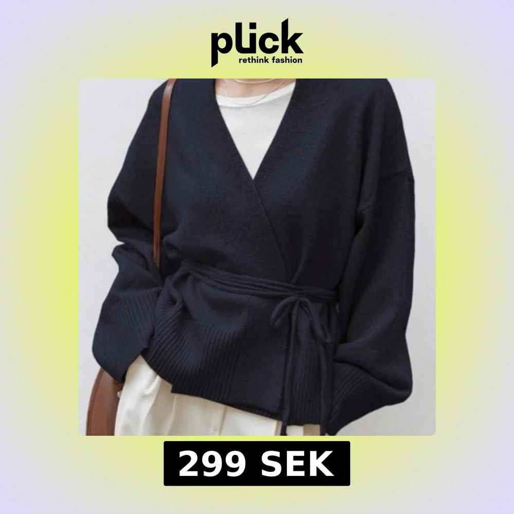 Snygg svart omlottkofta med knytband i midjan. Koftan har långa ärmar och ribbade detaljer vid ärmslut och nederkant. Perfekt för en stilren look.
