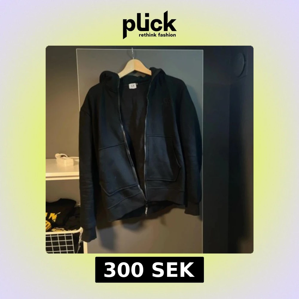 Svart hoodie från CP Company med ikoniska goggles i huvan. Tröjan har dragkedja framtill, två stora fickor och en relaxed passform. Perfekt för dig som vill sticka ut med streetwear-vibe. Materialet är mjuk bomull och huvan är riktigt fet. Tyvärr är zippen trasig lite nedanför halsen.