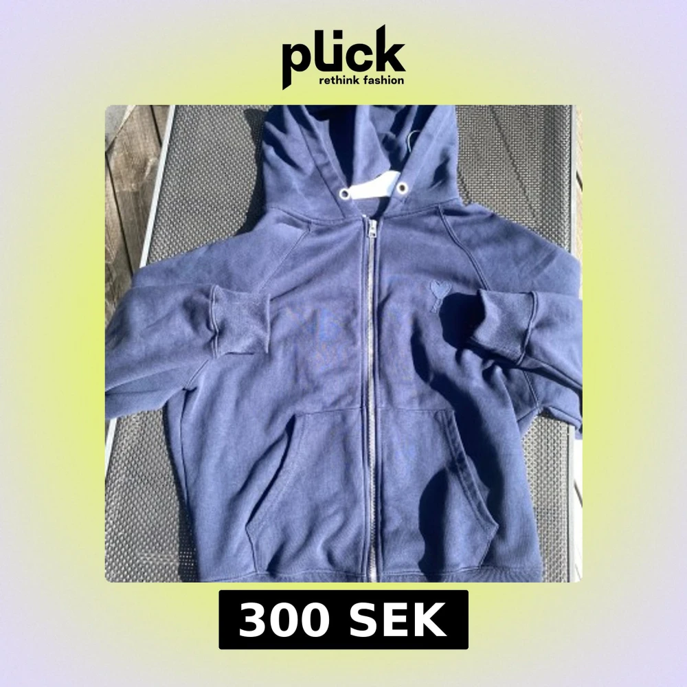 Säljer en marinblå hoodie från Ami Alexandre Mattiussi med dragkedja, huva och broderad hjärtlogga på bröstet. Tröjan har långa ärmar, ribbade muddar och känguruficka framtill. Perfekt för en chill och stilren look.