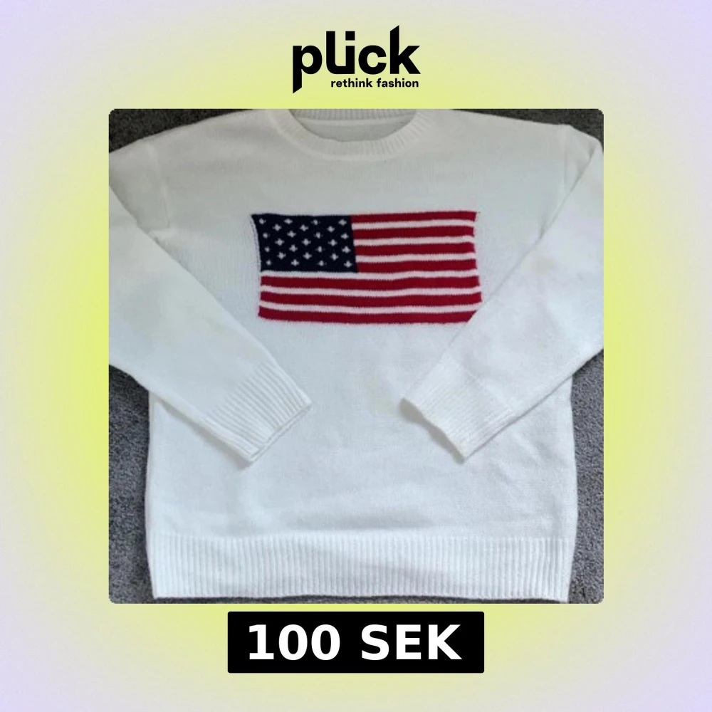 Snygg vit stickad tröja med lång ärm och ribbade muddar. På bröstet finns en stor USA-flagga i blått, rött och vitt som ger en cool och unik look. Perfekt för dig som gillar statement-plagg och vill sticka ut lite extra.
