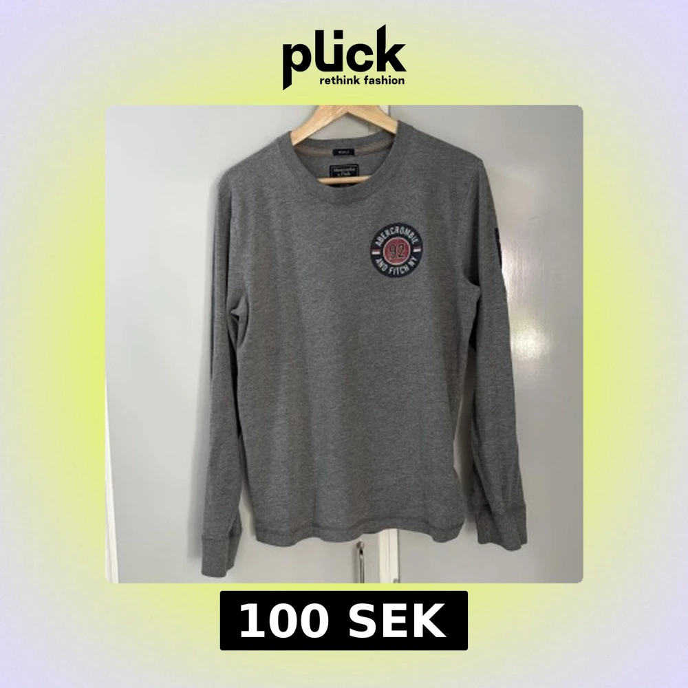Snygg grå långärmad tröja från Abercrombie & Fitch med tryckt logga och siffran 92 på bröstet. På ena ärmen står det 'Abercrombie' i rött och vitt. Tröjan har rund hals och är i mjuk bomull, perfekt för chill dagar.