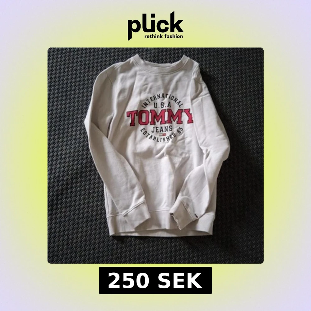 Vit sweatshirt från Tommy Jeans med stort rött och svart tryck på bröstet. Klassisk crewneck med ribbade muddar och liten broderad logga på ärmen. Regular fit och tillverkad i mjuk bomull. Perfekt för en chill och stilren look. Pris går att diskuteras.