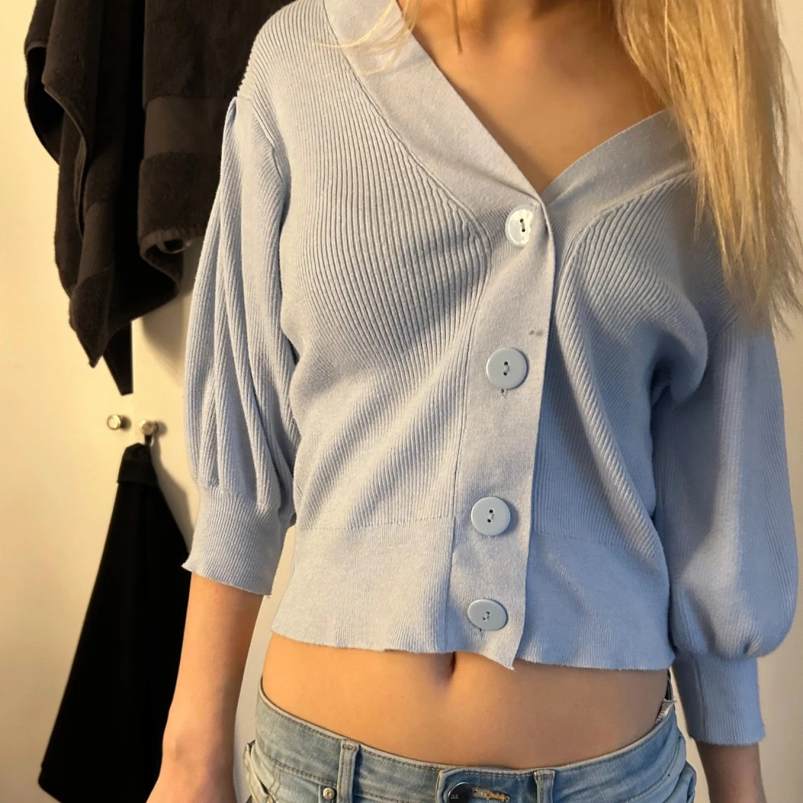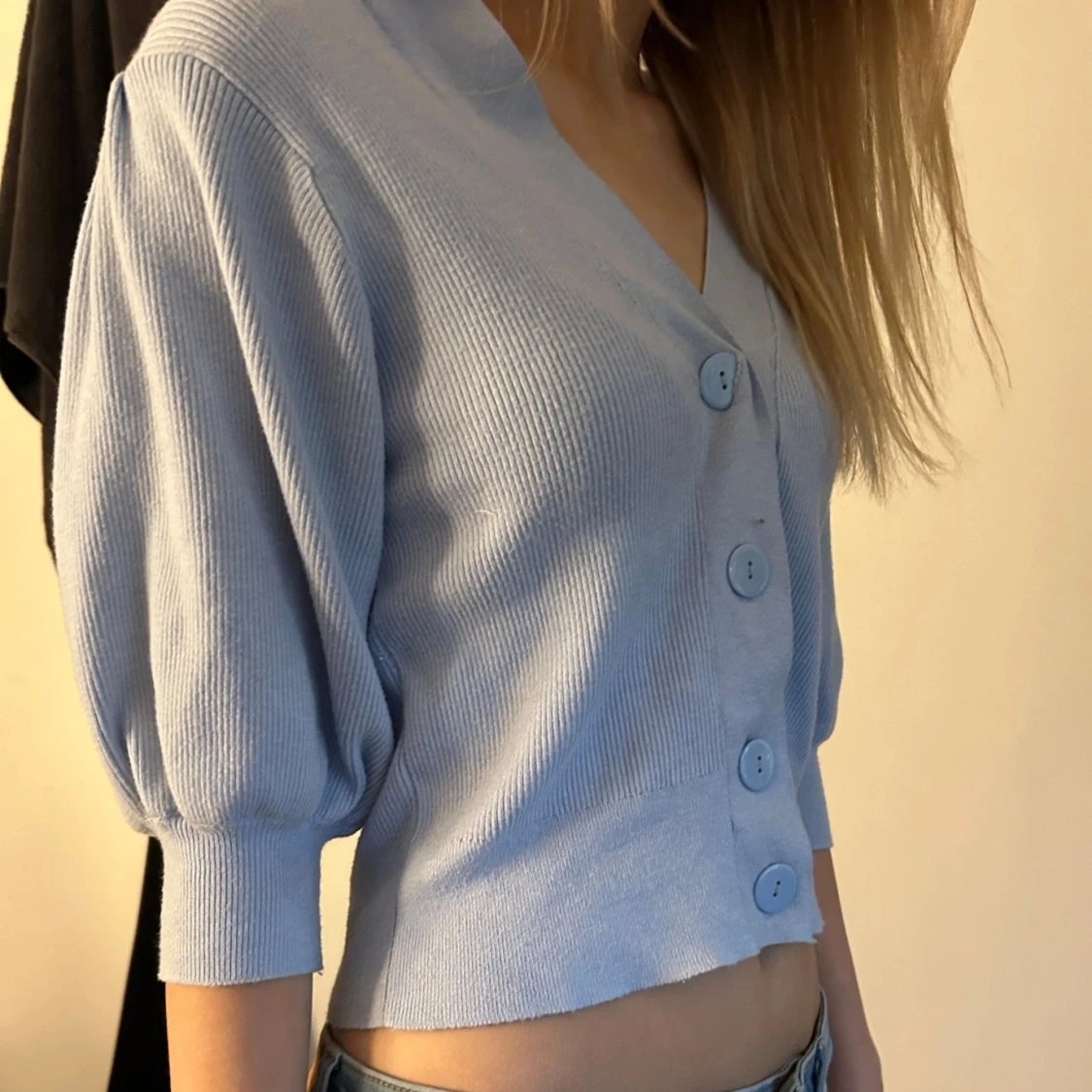Säljer en ljusblå kofta med trekvartsärm och stora knappar framtill. Storlek S