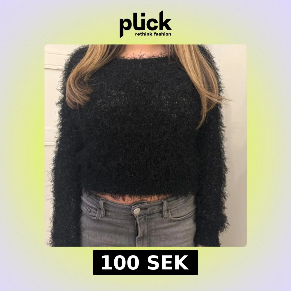 Säljer en svart fluffig tröja med glittrande detaljer. Tröjan är croppad och har långa ärmar, perfekt för en trendig look. Passar bra till både jeans och kjol. Perfekt för höst och vinter!
