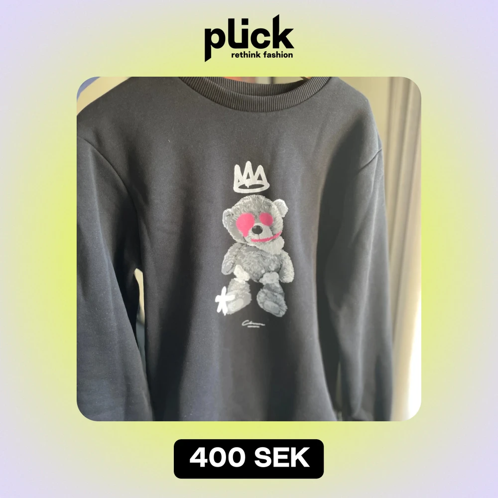 Snygg svart sweatshirt med tryck av en teddybjörn med krona och hjärtformade glasögon.