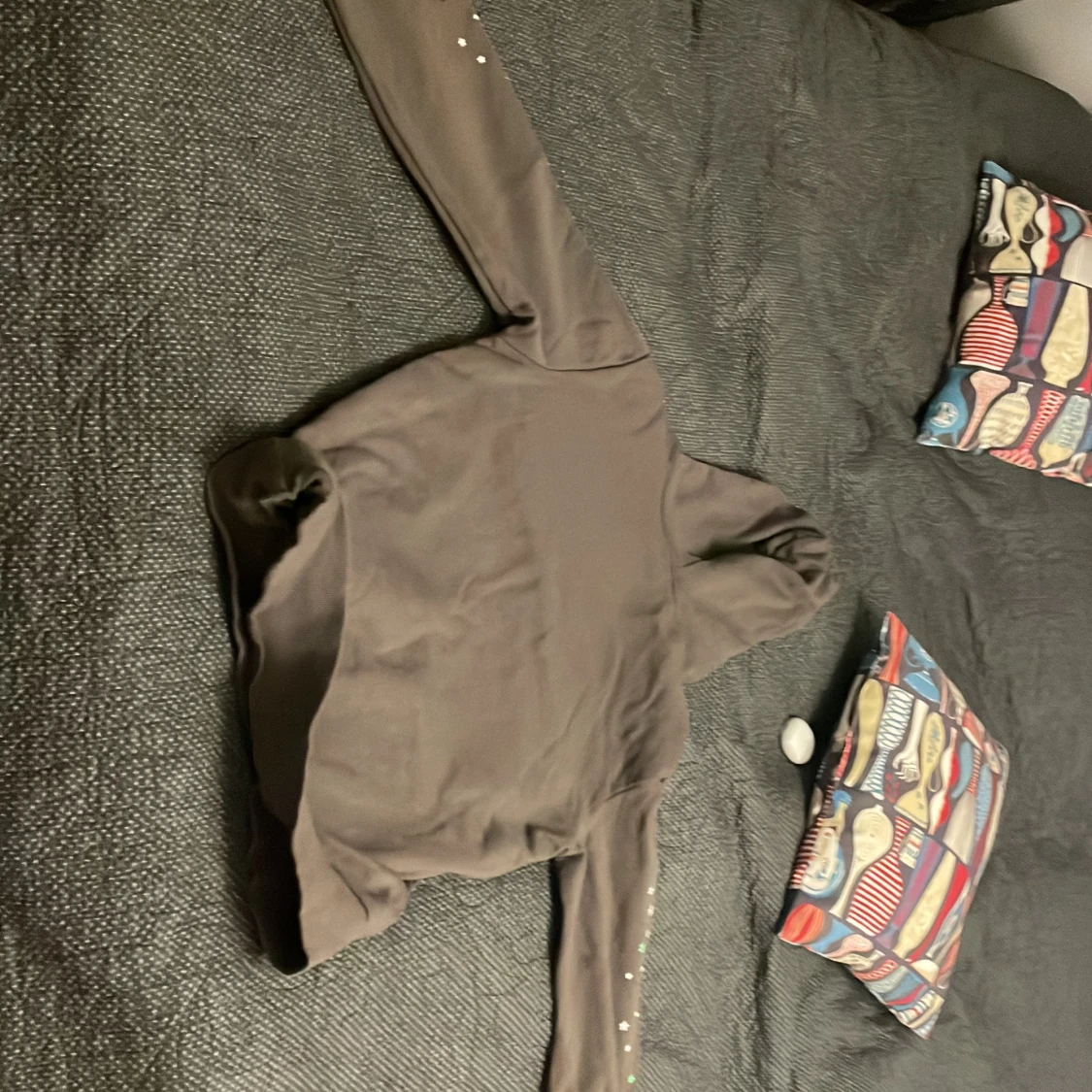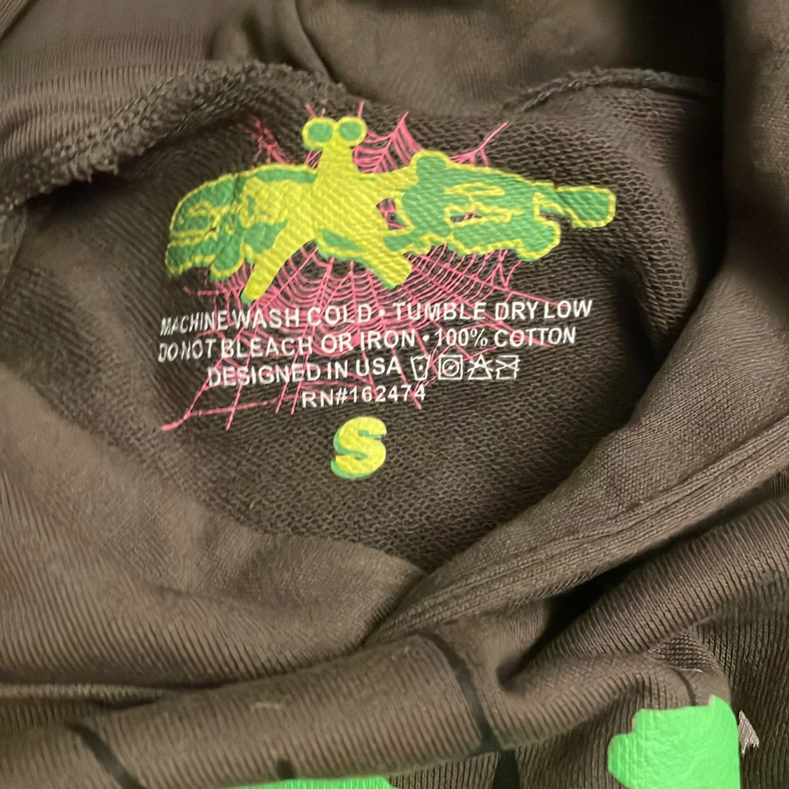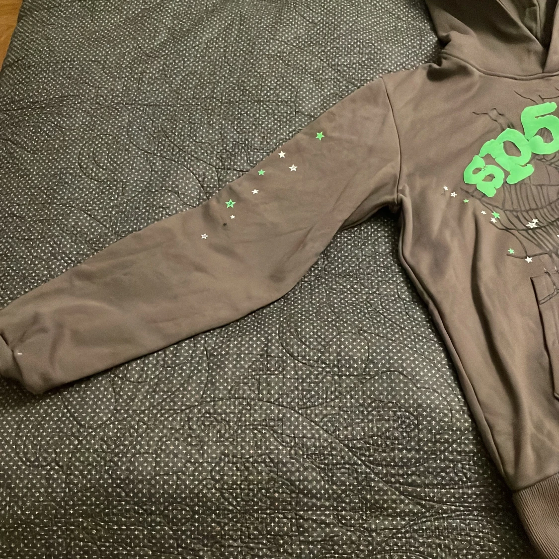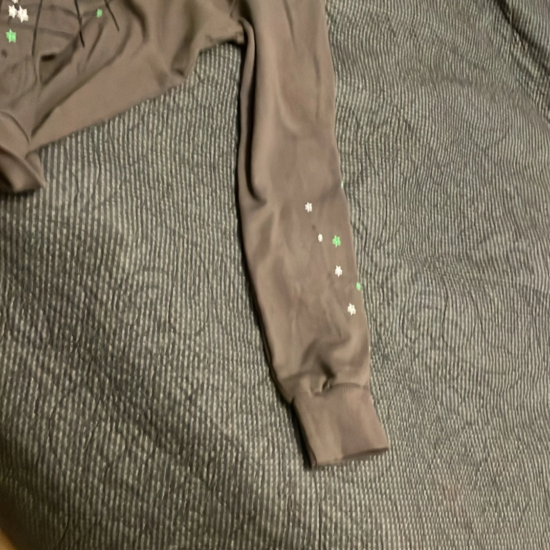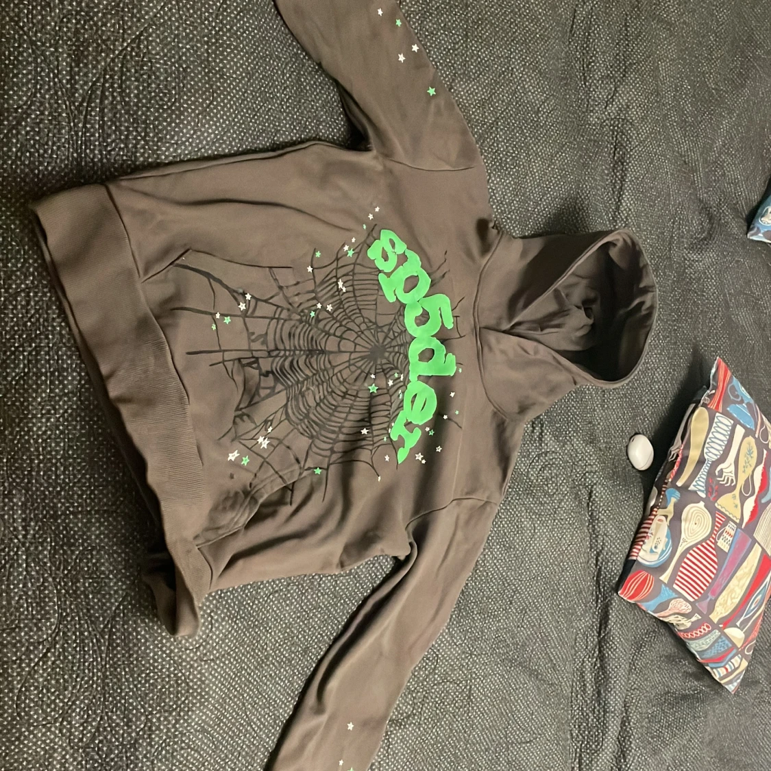 Cool brun hoodie från Sp5der med ett stort grönt tryck och spindelnätsdesign på framsidan. Tröjan har långa ärmar med små stjärnor och en klassisk huva. Perfekt för en avslappnad stil. Vid snabb affär kan priset sänkas
