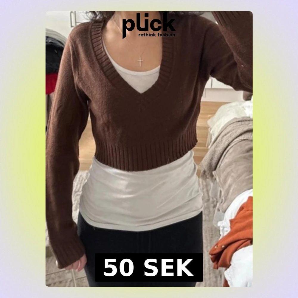 Snygg brun croppad stickad tröja med djup v-ringning och ribbade muddar. Perfekt att bära över ett linne eller t-shirt för en trendig lager-på-lager-look. Mjuk och skön, passar till både jeans och kjol.