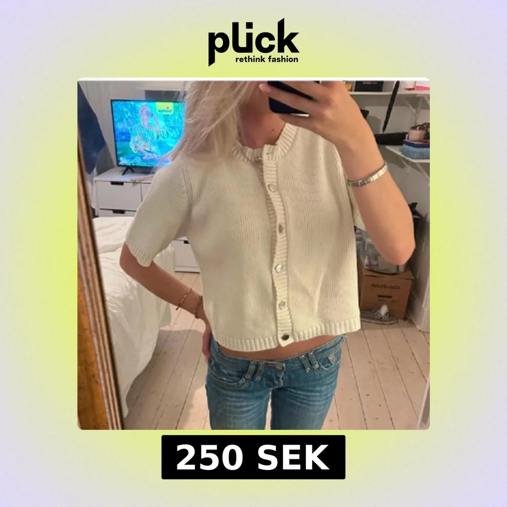 Säljer en stilren vit ribbad kofta med korta ärmar och knappar framtill. Perfekt för en skoldag och utekväll💕