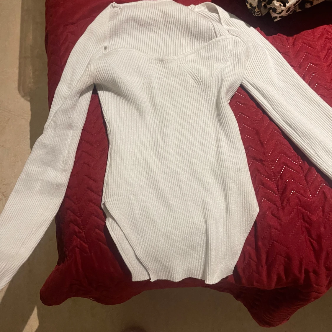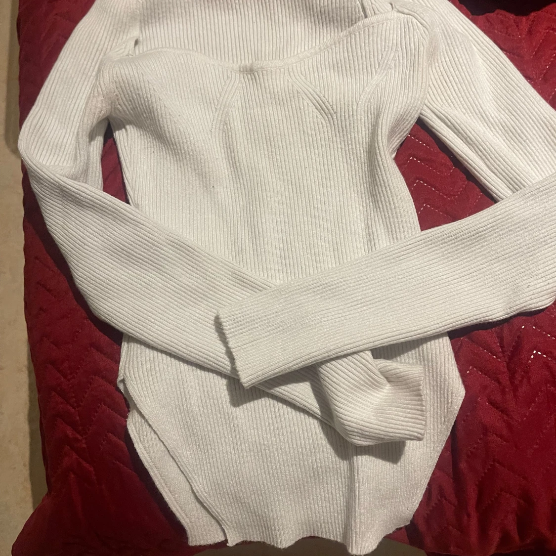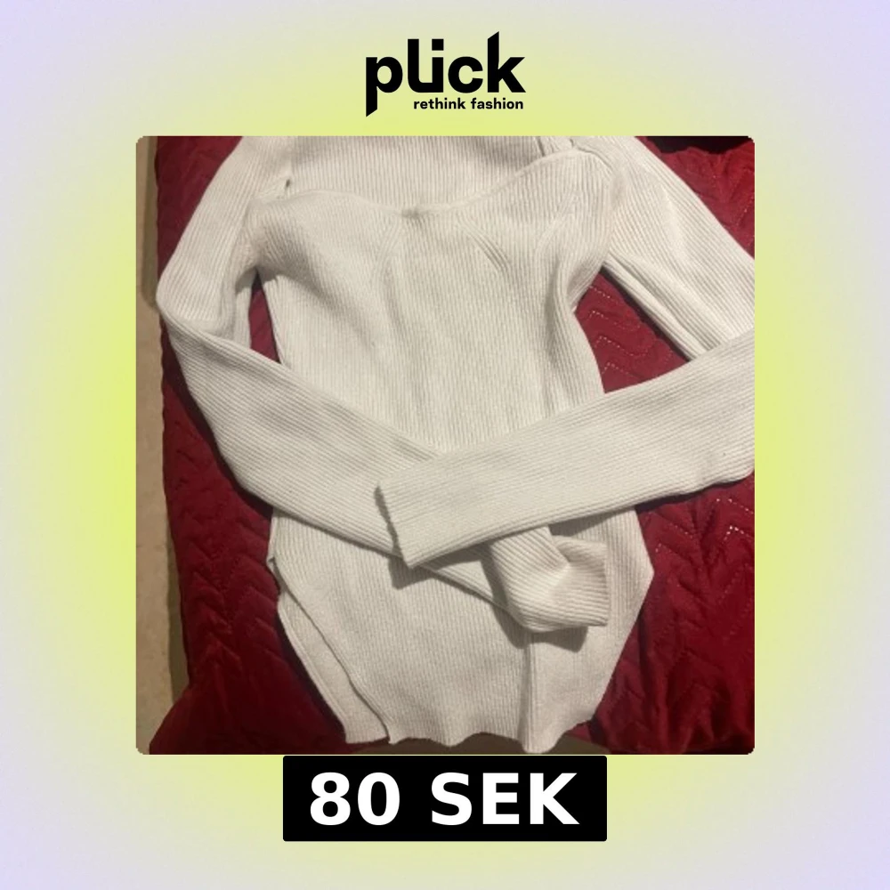 Säljer en stilren vit ribbad tröja med långärmad design. Perfekt för lager-på-lager under kyligare dagar. Tröjan har en figurnära passform och är tillverkad i ett mjukt material.