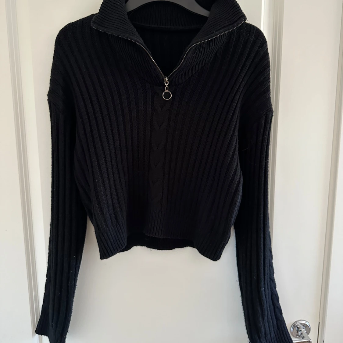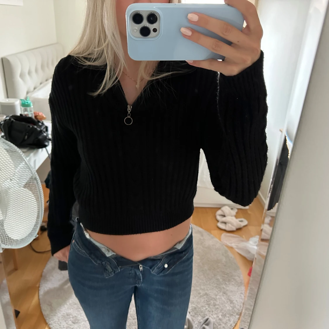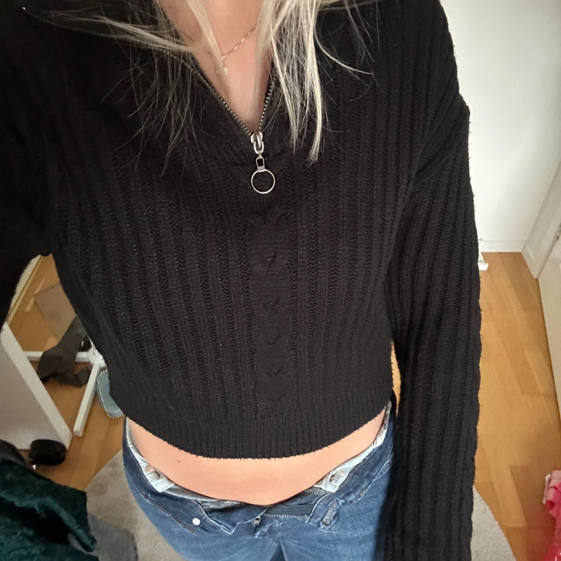 Säljer en snygg svart ribbad tröja som är croppad och har en dragkedja framtill. Perfekt för en cool och avslappnad stil. Tröjan har långa ärmar och är supermjuk och bekväm att ha på sig. Passar perfekt till jeans eller kjol för en trendig look!