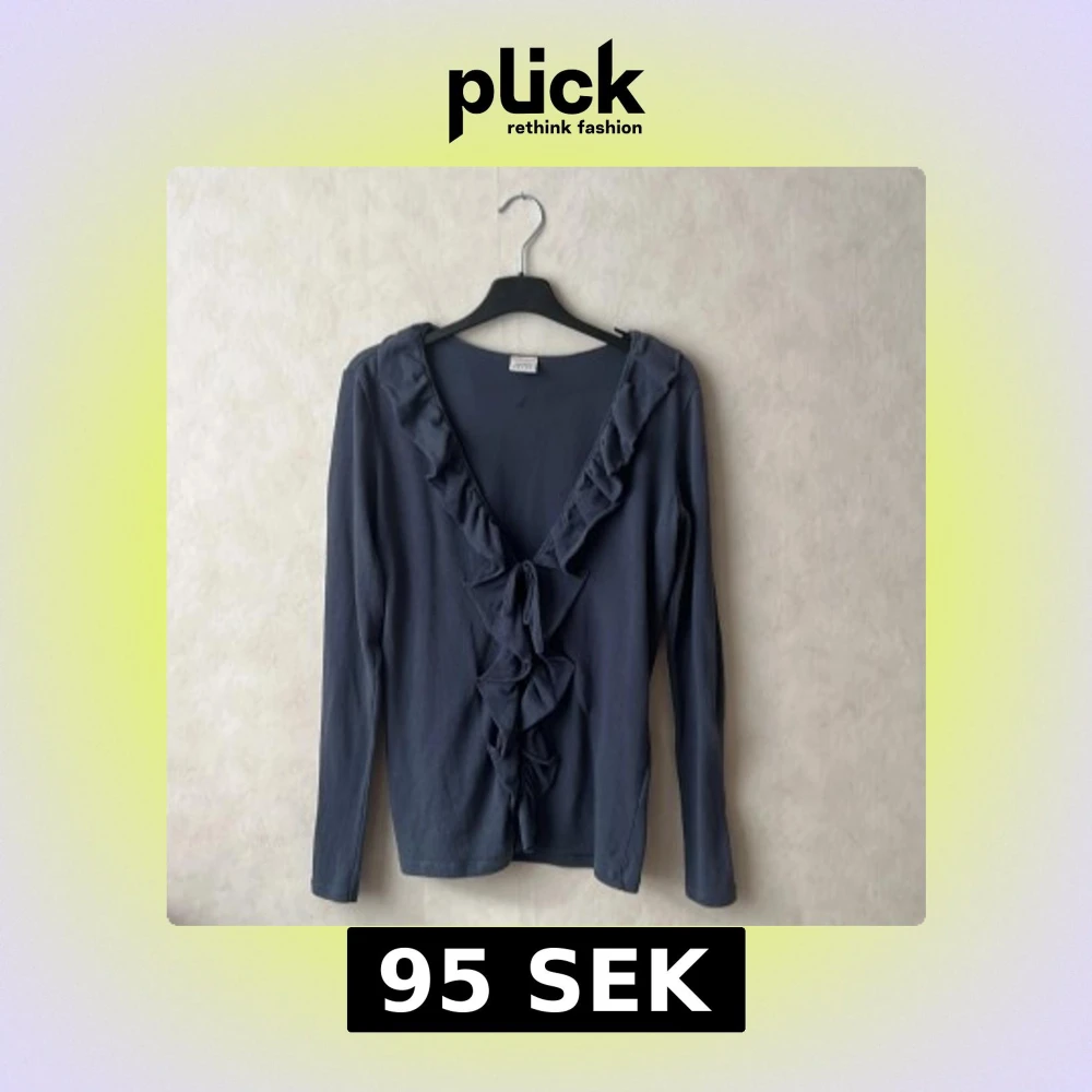 Supersöt mörkblå långärmad tröja från Esprit med djup v-ringning, volangdetaljer längs ringningen och knyt framtill. Perfekt för dig som gillar en feminin och trendig look. Passar xs-m beroende på hur man vill att den ska sitta. Bra skick.