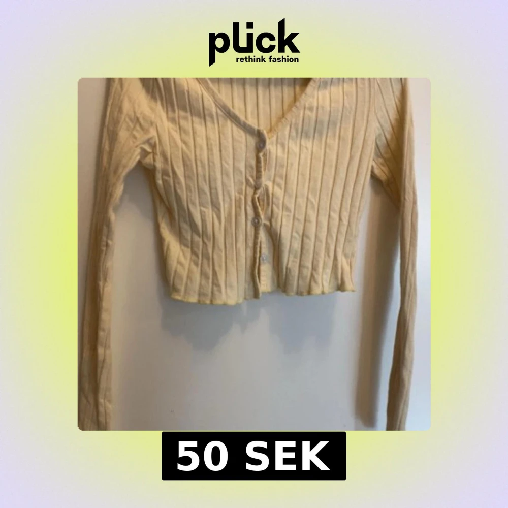Säljer en söt gul ribbad kofta med v-ringning och knappar framtill. Den är croppad och har långa ärmar, perfekt för lager på lager-stil. Passar bra till både jeans och kjol! Den är i nyskick från Shein i storlek S