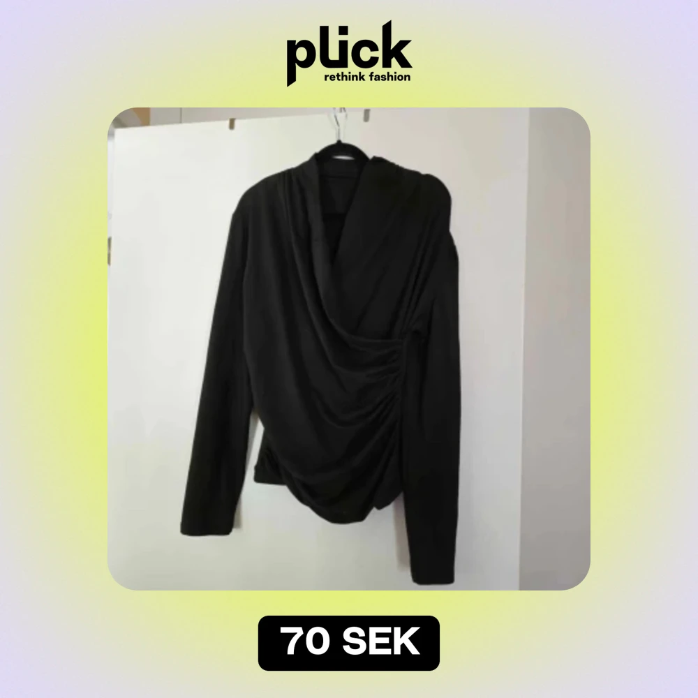 Säljer en elegant svart omlottopp med långa ärmar. Perfekt för höst och vinter, den har en draperad design som ger en snygg och stilren look. Passar både till vardags och festliga tillfällen. Passar s/m