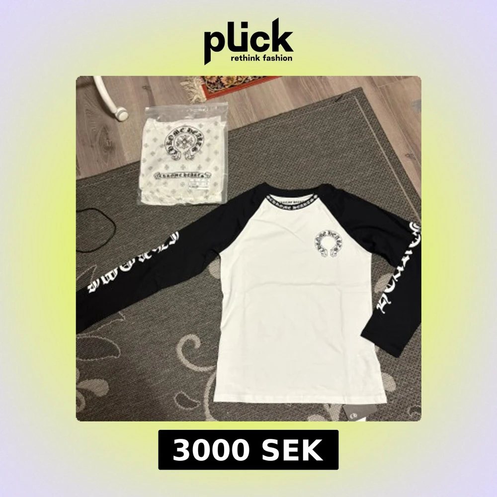 Säljer en svartvit långärmad tröja från Chrome Hearts med kontrastfärgade ärmar och stora tryck på både bröstet och ryggen. Tröjan har coola logodetaljer längs halsen och ärmarna, och är gjord i mjuk bomull. Perfekt för dig som gillar streetwear och vill sticka ut.