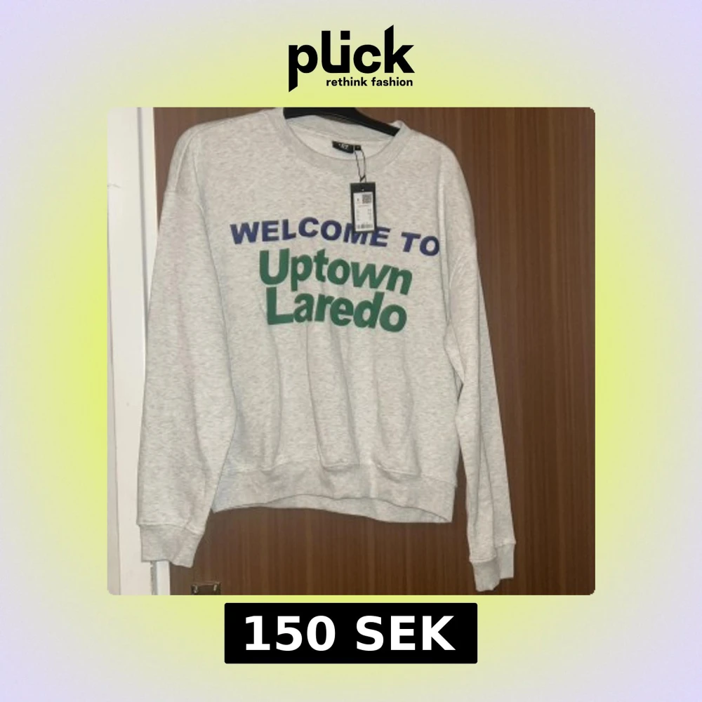 Grå sweatshirt med trycket 'WELCOME TO Uptown Laredo' i blått och grönt framtill. Klassisk rund halsringning och ribbade muddar vid ärmslut och nederkant. Perfekt för en chill och avslappnad stil.