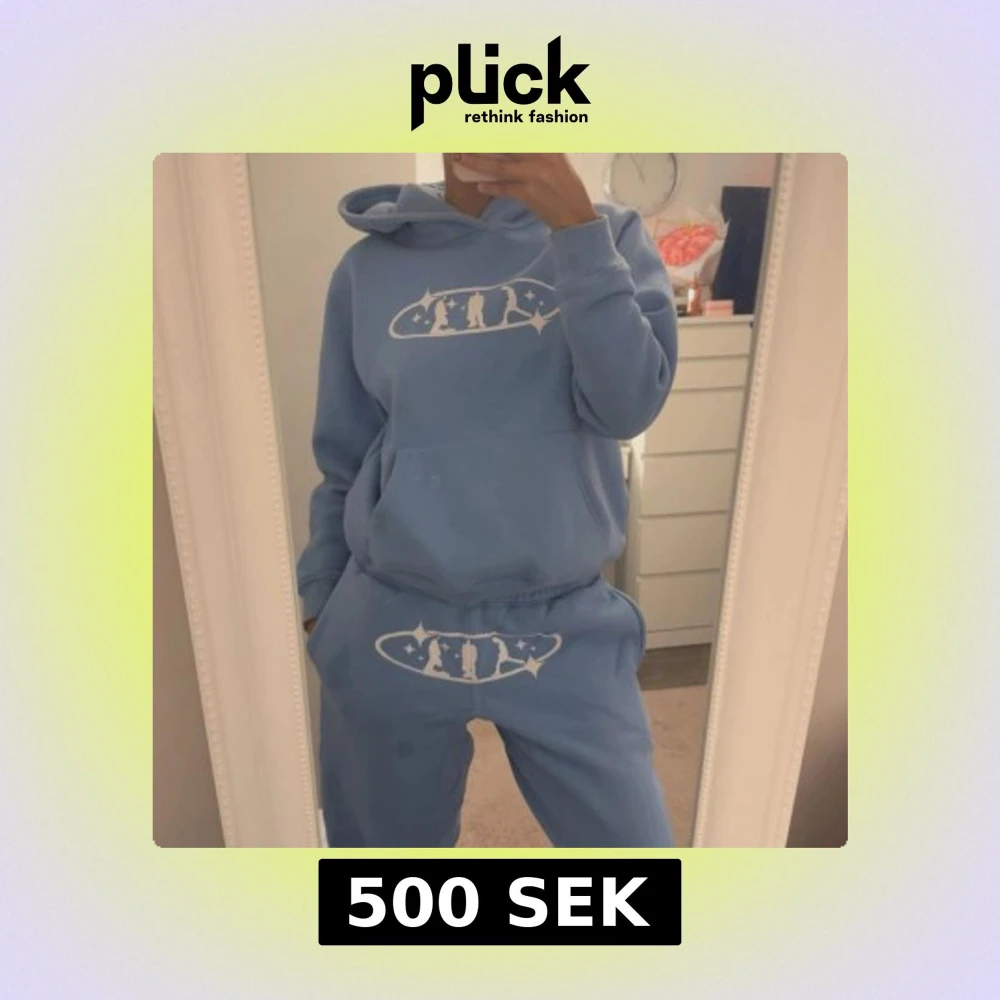 Säljer en ljusblå hoodie med vit grafiskt tryck framtill. Tröjan har huva, magficka och långa ärmar. Mjuk och skön, perfekt för chill dagar. Passformen är loose och materialet känns som bomull eller fleece.
