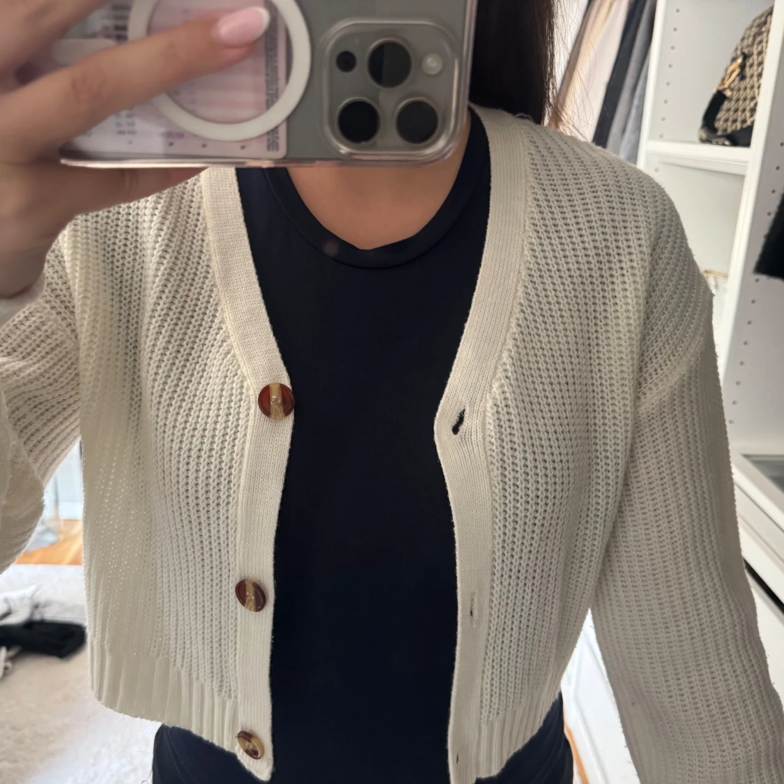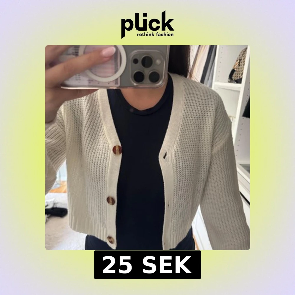 Säljer en vit stickad kofta med snygga bruna knappar framtill.