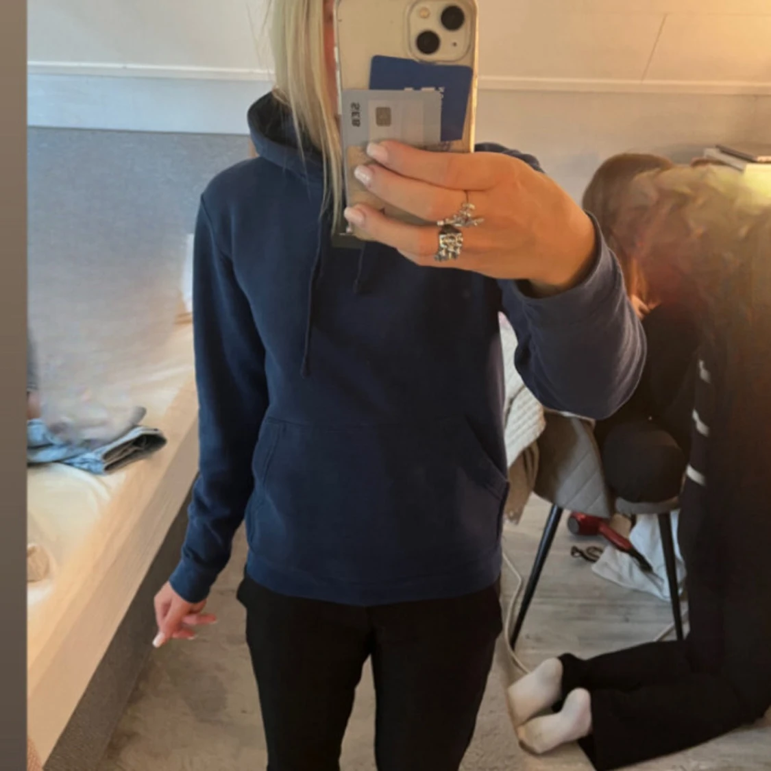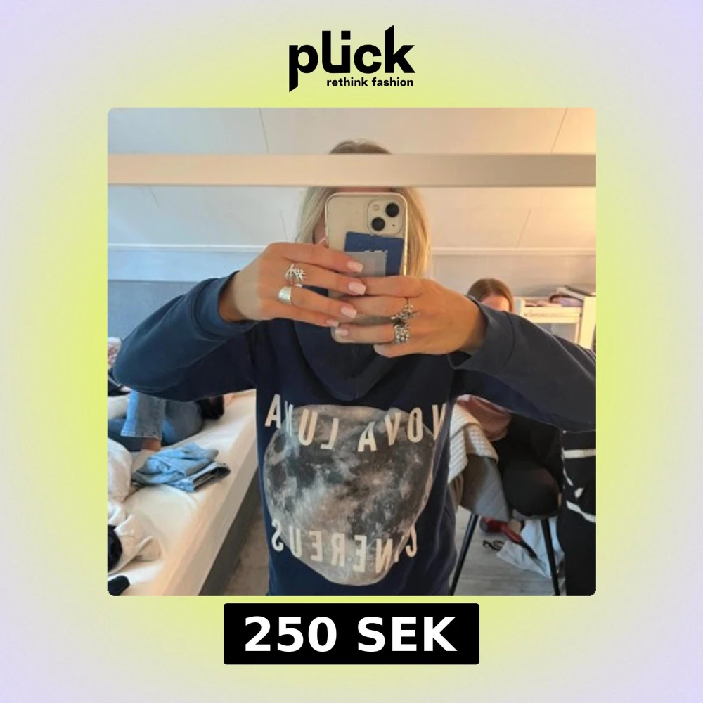 Säljer en mörkblå hoodie med coolt tryck av månen och texten 'NOVA LUNA CENERUS' på framsidan. Tröjan har huva med snörning och en stor magficka. Perfekt för dig som gillar rymdinspirerade plagg och vill ha en skön, avslappnad stil.
