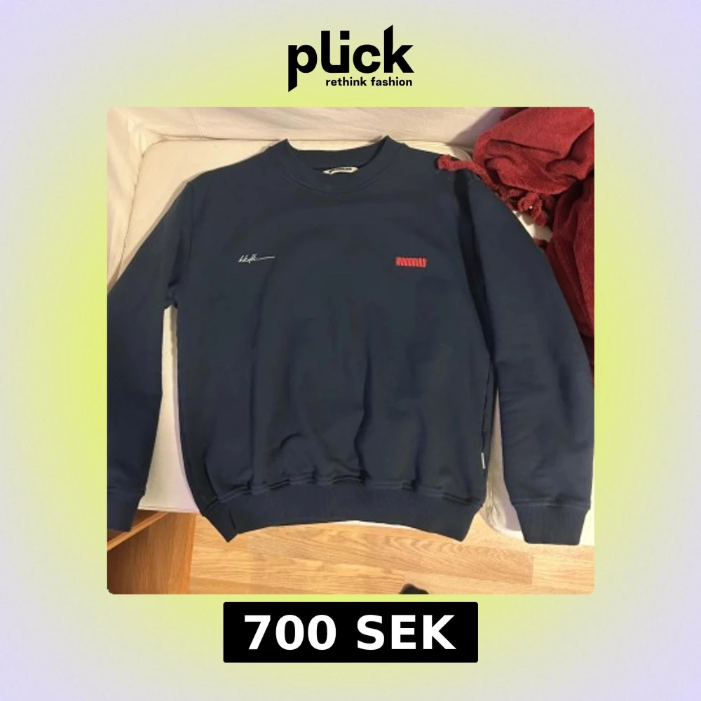 Snygg mörkblå sweatshirt från Woodbird med tryck i rött och vitt både fram och bak. Tröjan har rund hals, ribbade muddar och är långärmad. Materialet är mjuk bomull som känns skönt mot huden. Perfekt för dig som gillar stilrena och coola prints.