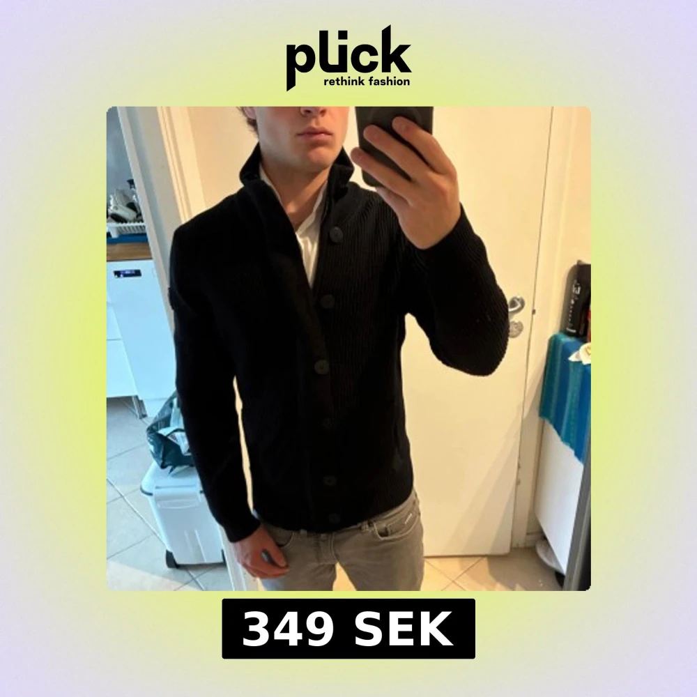 Snygg svart ribbad kofta från Marina Yachting med hög krage och stora knappar framtill. Tröjan är stickad i ull och har långärmad passform. Perfekt för dig som gillar stilrena och klassiska plagg med lite edge. Bra skick