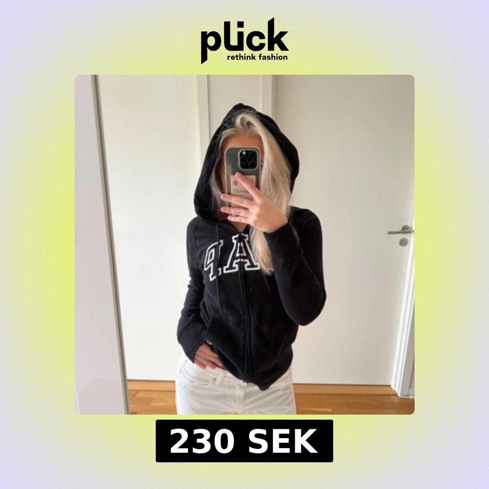 Svart hoodie från GAP med vit broderad logga på bröstet. Tröjan har huva med snörning, dragkedja framtill och två fickor. Mjuk bomullskänsla och långärmad modell som passar perfekt för chill dagar. Snygg och enkel att matcha med jeans eller mjukis.