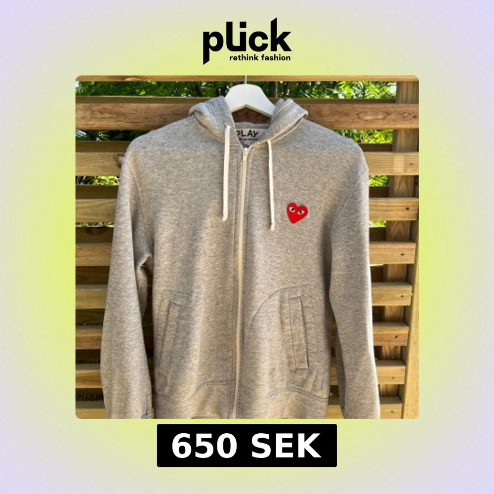 Grå hoodie med dragkedja och huva från Comme des Garçons Play i storlek S men passar även XS. Har röda hjärtan med ögon broderade på bröstet och tryckta på ryggen tillsammans med loggan. Två fickor framtill och vita snören i huvan. Tröjan är köpt i butik och är ÄKTA. Endast använd ett fåtal gånger.