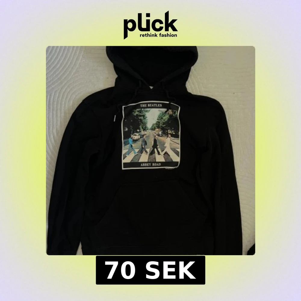 Svart hoodie med tryck av The Beatles Abbey Road-albumomslag på bröstet. Tröjan har huva med dragsko och en klassisk känguruficka framtill.