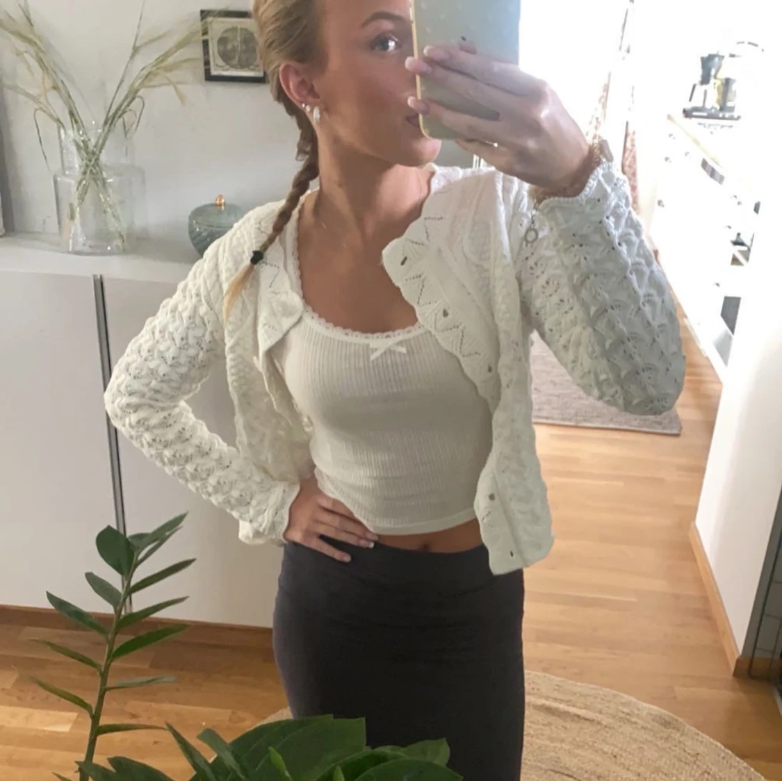 Supersöt vit stickad cardigan kofta med fina hålmönster och vågig kant. Perfekt att slänga över ett linne eller klänning för en extra touch😍😍😍 Kostar 500kr i vanliga fall och har knappt använt!!