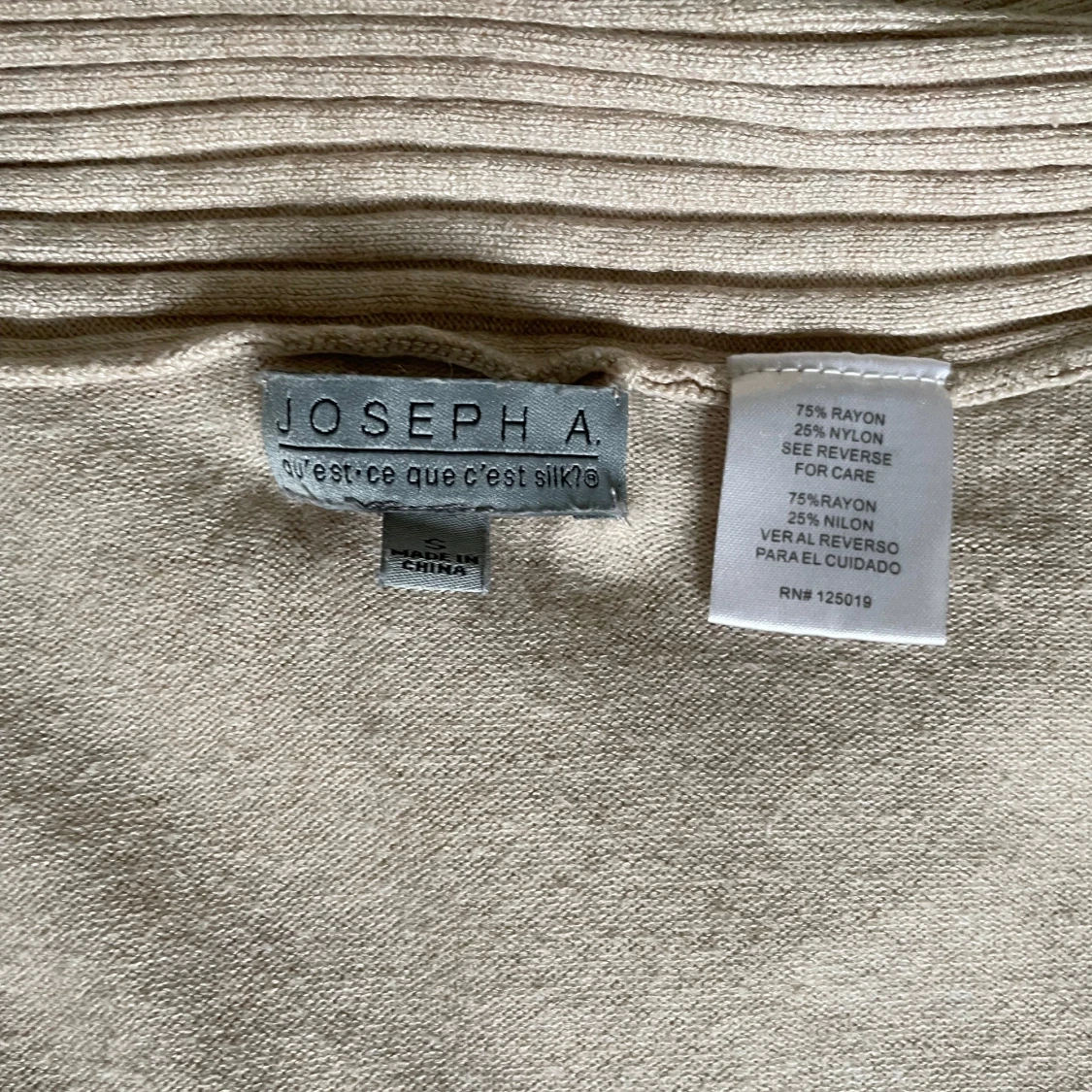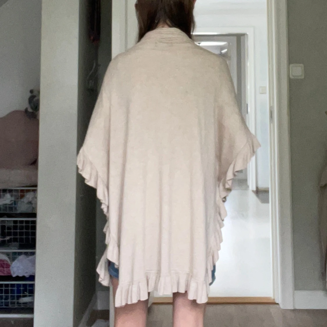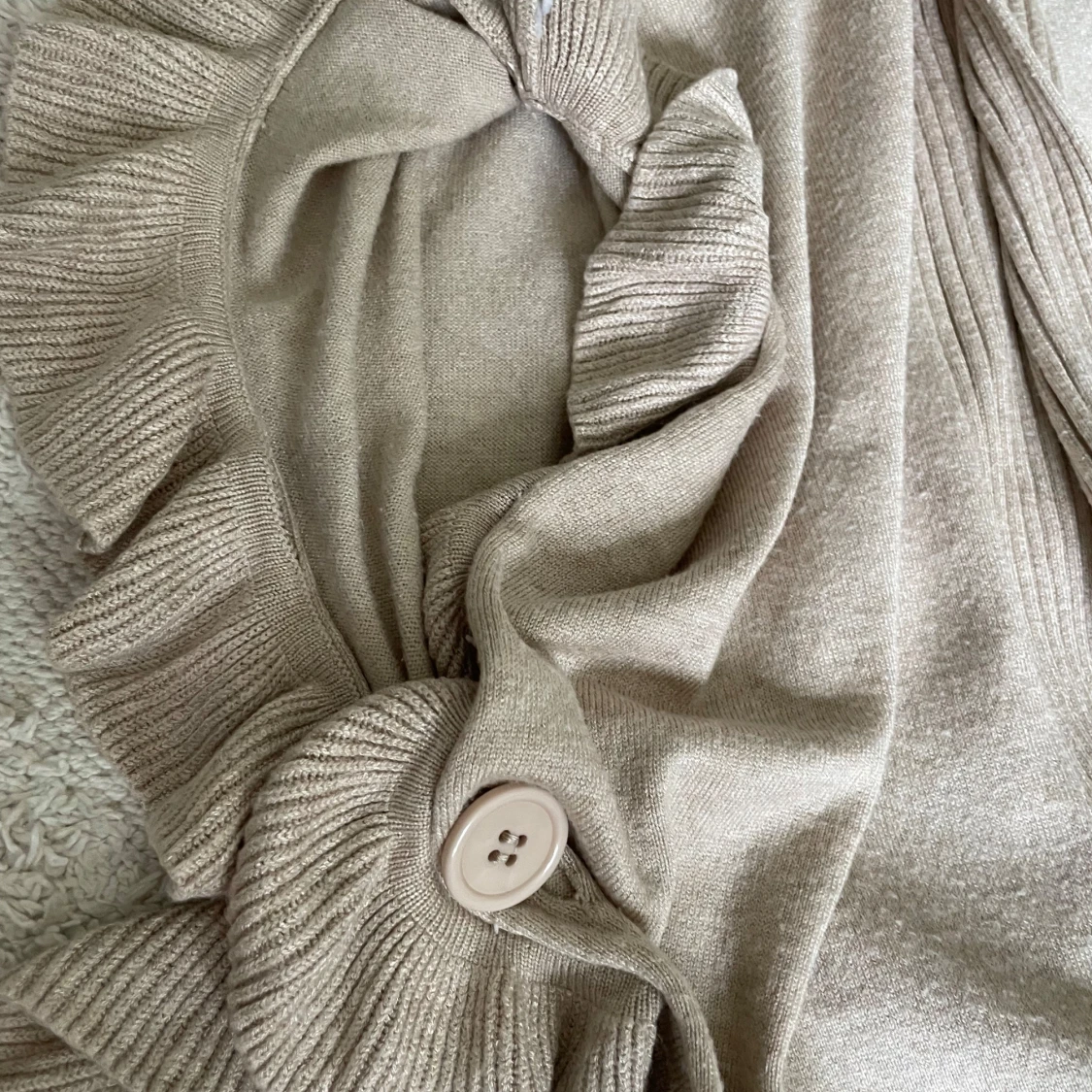 Beige stickad väst från Joseph A. med snygga volangdetaljer längs kanterna och en knapp för armarna om går att ta ut. Västen är loose fit och har öppen front, perfekt att slänga över en t-shirt eller blus. Materialet är mjukt och skönt, en mix av rayon och nylon.