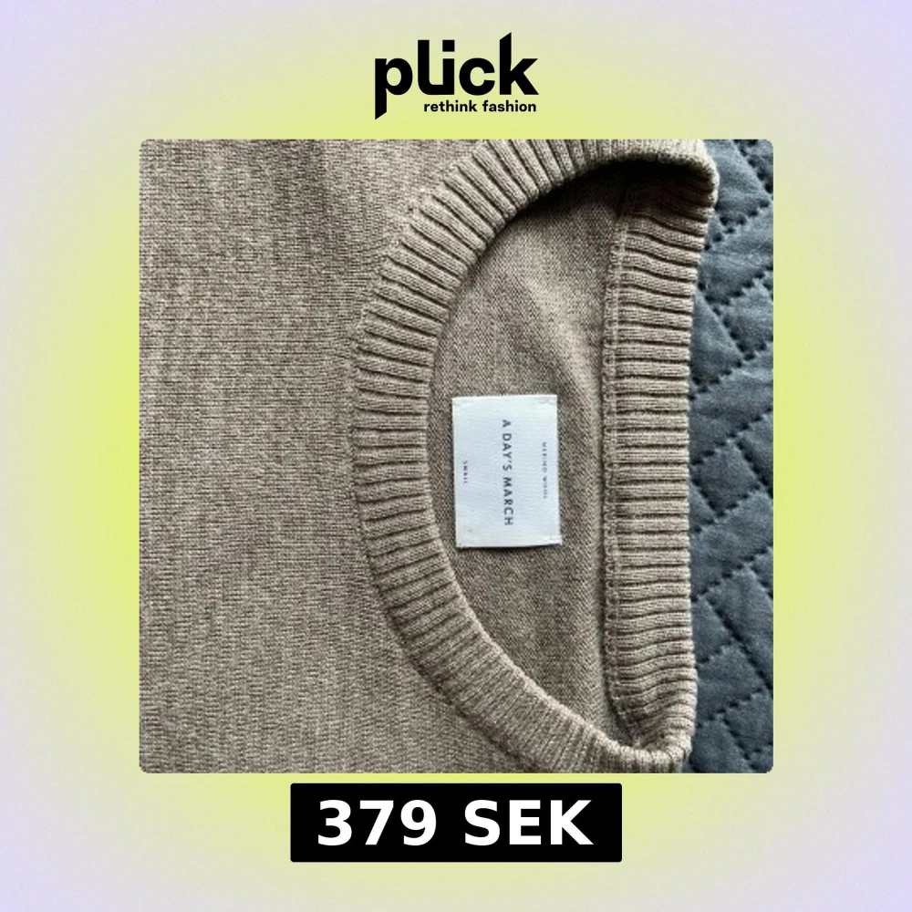 Säljer en stilren beige stickad tröja från A Day's March i mjuk merinoull. Tröjan har rund halsringning, ribbade muddar och lång ärm. Perfekt för lager-på-lager under höst och vinter.