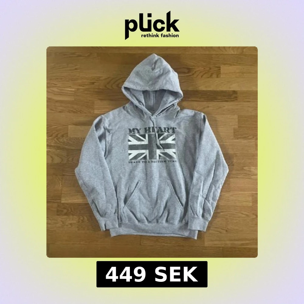 Grå hoodie med tryck av brittiska flaggan och texten 'MY HEART BEATS TO A BRITISH TUNE' på bröstet. Tröjan har huva med snörning och en stor magficka. Perfekt för dig som gillar streetstyle och vill sticka ut lite extra.