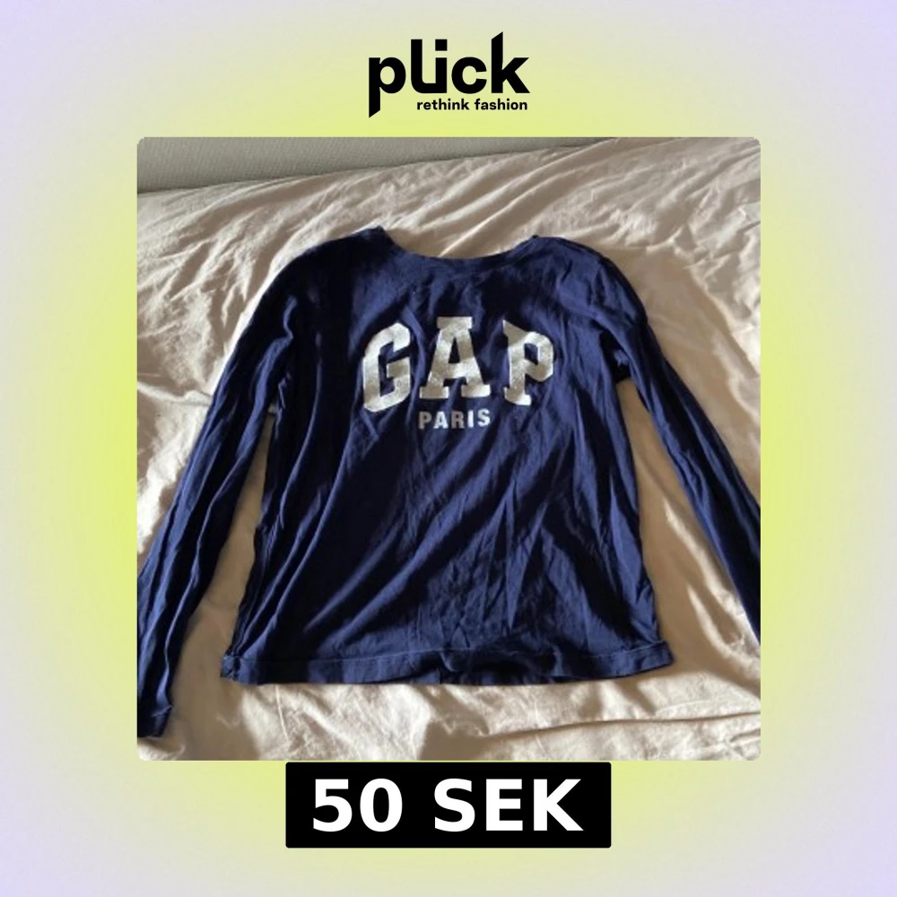 Säljer en mörkblå långärmad tröja från GAP med trycket 'GAP PARIS' i vitt framtill. Tröjan har en klassisk passform och är gjord i mjuk bomull, perfekt för en avslappnad stil.