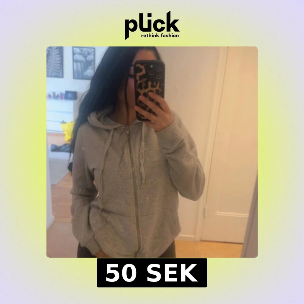 Grå hoodie med dragkedja och huva. Tröjan har långa ärmar och fickor framtill.