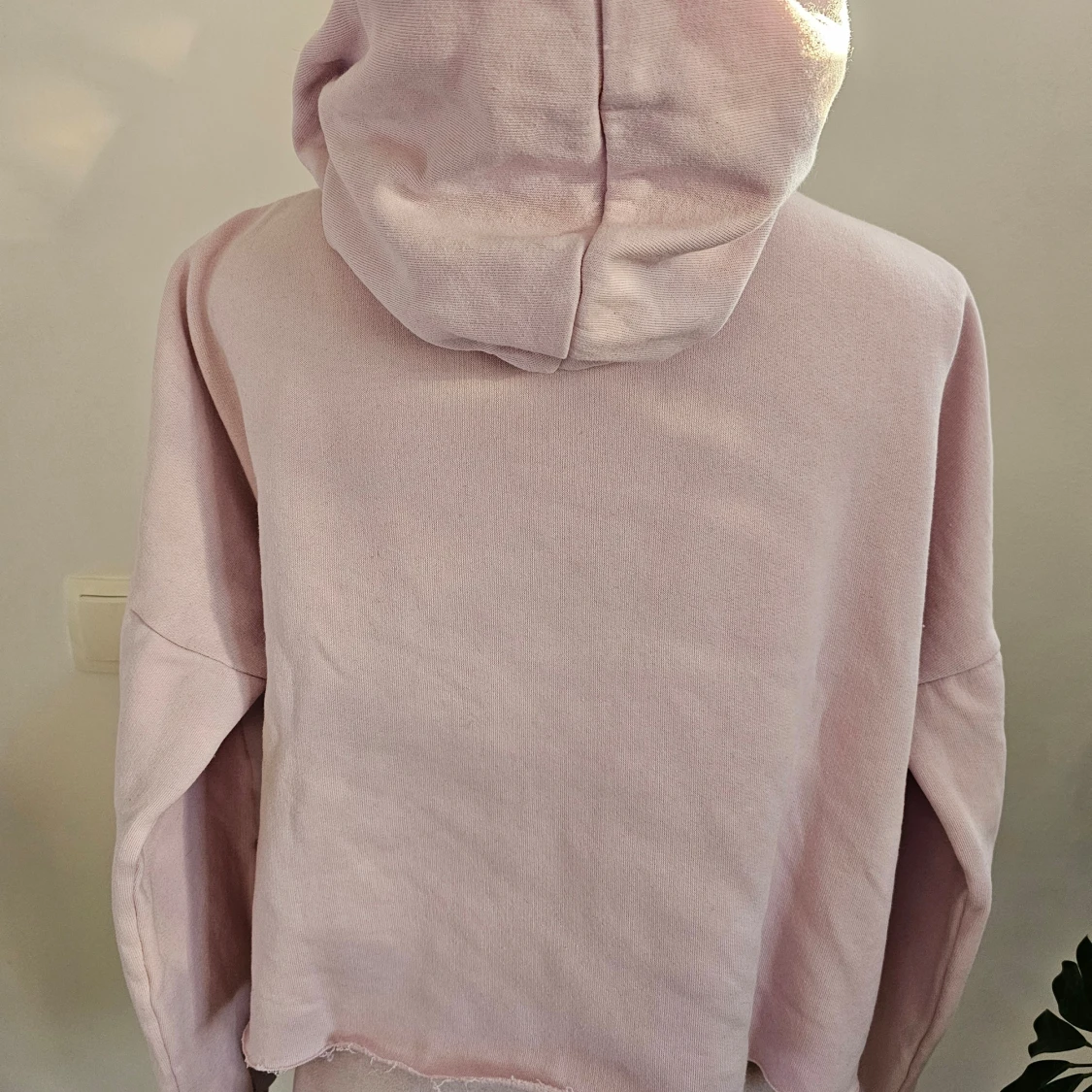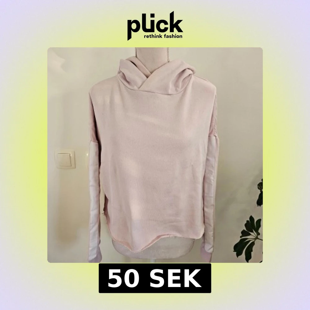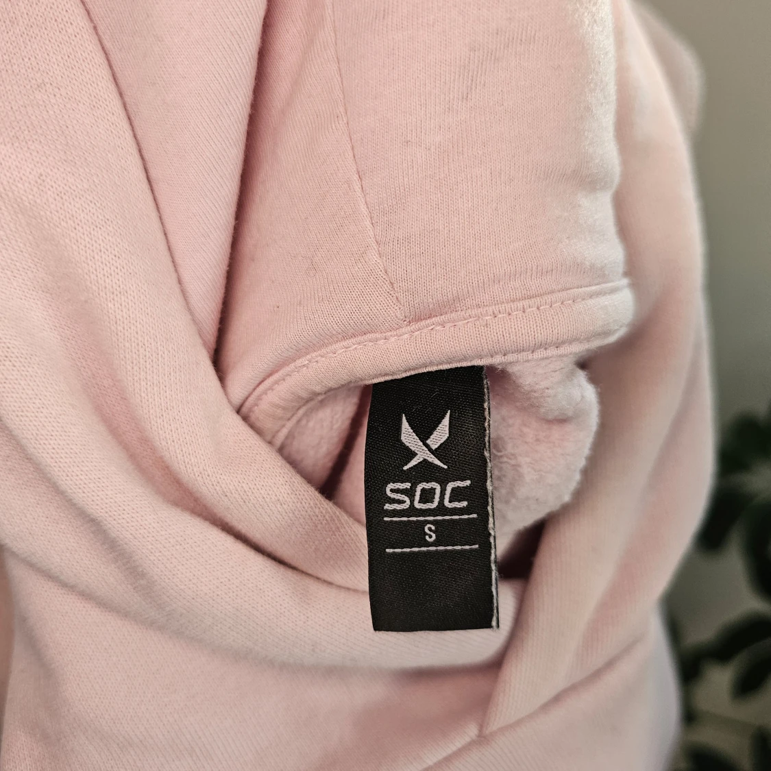 Mysig ljusrosa hoodie från SOC i storlek S. Tröjan har en avslappnad passform med en stor huva och långa ärmar. Lätt missfärgning vid kragen och en mindre fläck finns som jag ej försökt ta bort.