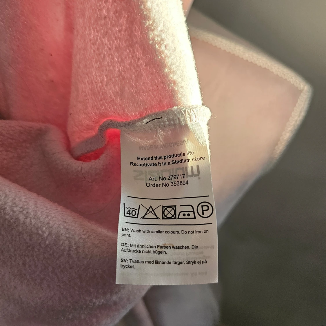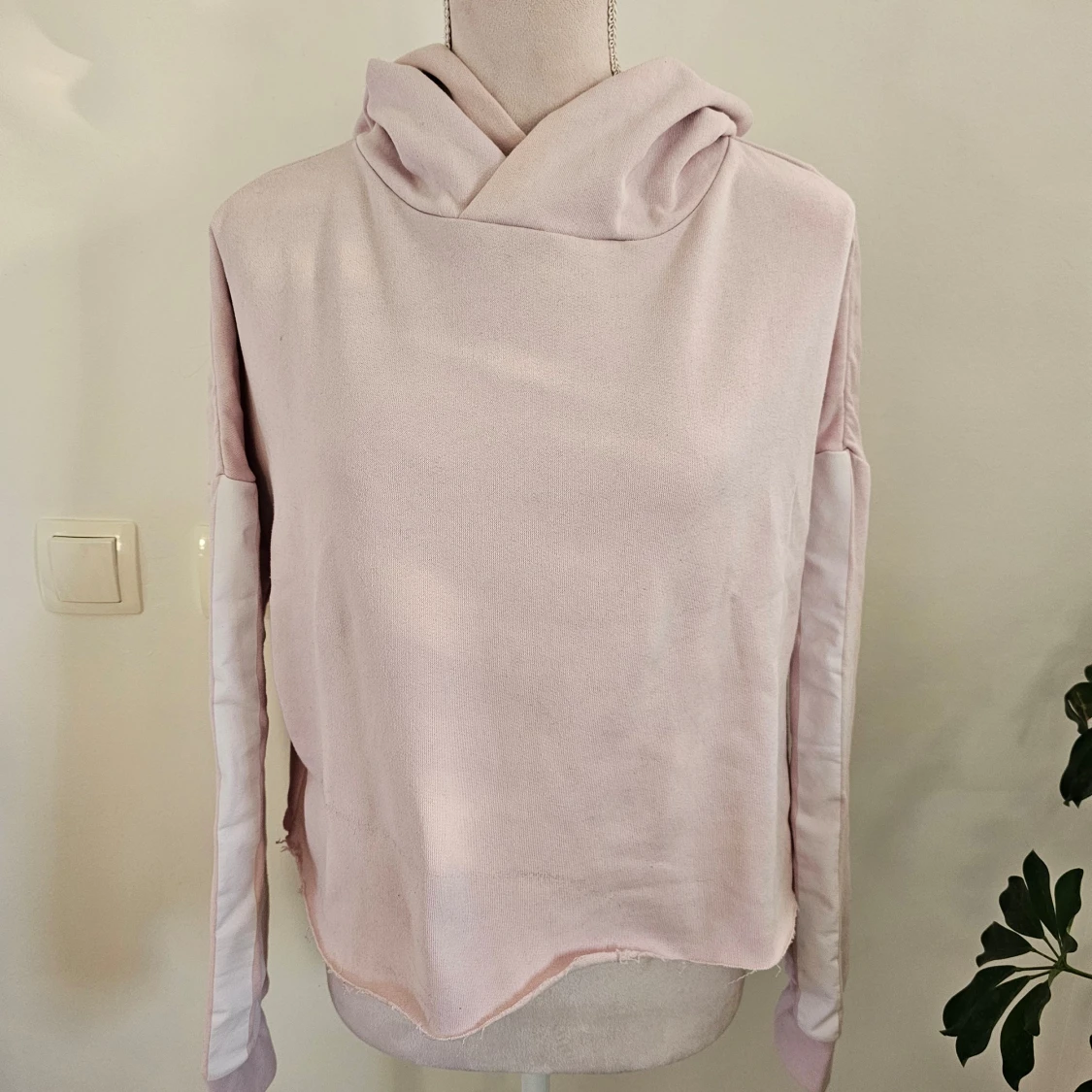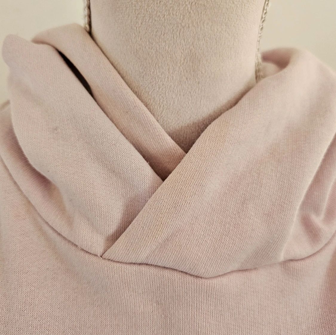 Mysig ljusrosa hoodie från SOC i storlek S. Tröjan har en avslappnad passform med en stor huva och långa ärmar. Lätt missfärgning vid kragen och en mindre fläck finns som jag ej försökt ta bort.