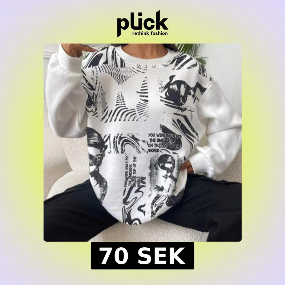 Cool vit sweatshirt med oversized passform och svart grafiskt tryck framtill. Tröjan har rund halsringning, långa ärmar och tryck med text och bilder i streetstyle. Perfekt för dig som gillar statement-plagg och en avslappnad look.