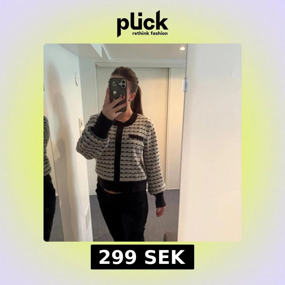 Säljer en stilren svartvit rutig kofta med svarta muddar och detaljer. Koftan har långa ärmar och fickor på bröstet. Perfekt för en chic och avslappnad look.
