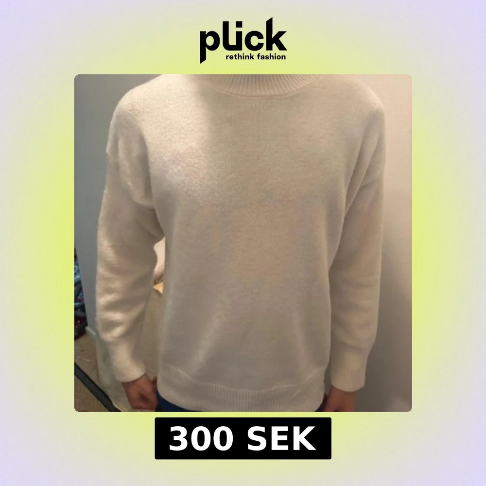 Säljer en enkel och stilren vit stickad tröja med rund hals och långa ärmar. Tröjan har ribbade muddar vid ärmslut, hals och nederkant. Använt en gång