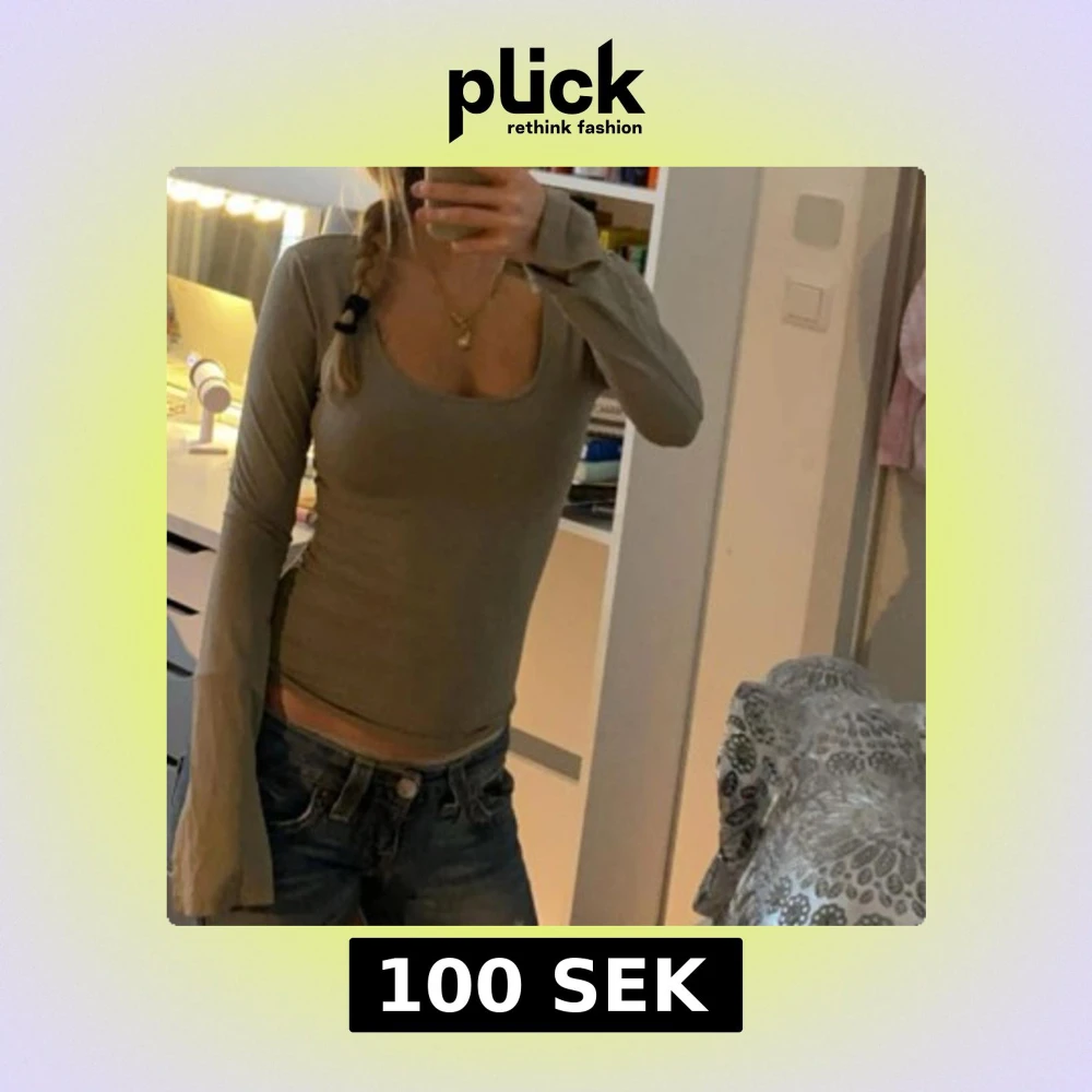 Säljer en stilren beige långärmad topp med djup rund halsringning. Perfekt för en avslappnad look. Passar bra till jeans eller kjol.