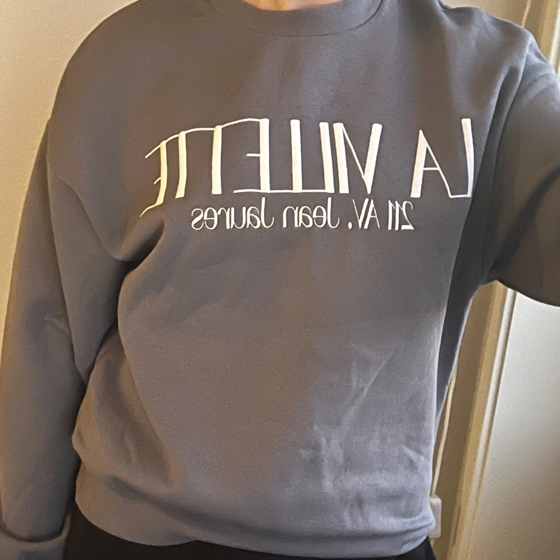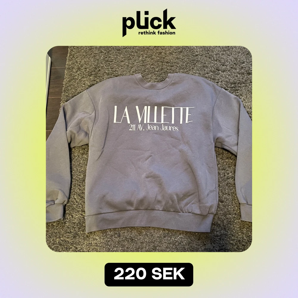 Säljer en mörkgrå sweatshirt med trycket 'LA VILLETTE 211 Av. Jean Jaures' på framsidan. Tröjan har en avslappnad passform och är perfekt för en casual look. Den är i bra skick och passar både till vardags och mysiga hemmakvällar. Den är ifrån Gina tricot. Använd nån enstaka gång men inget som syns. Superfin och bekväm tröja i storlek S.