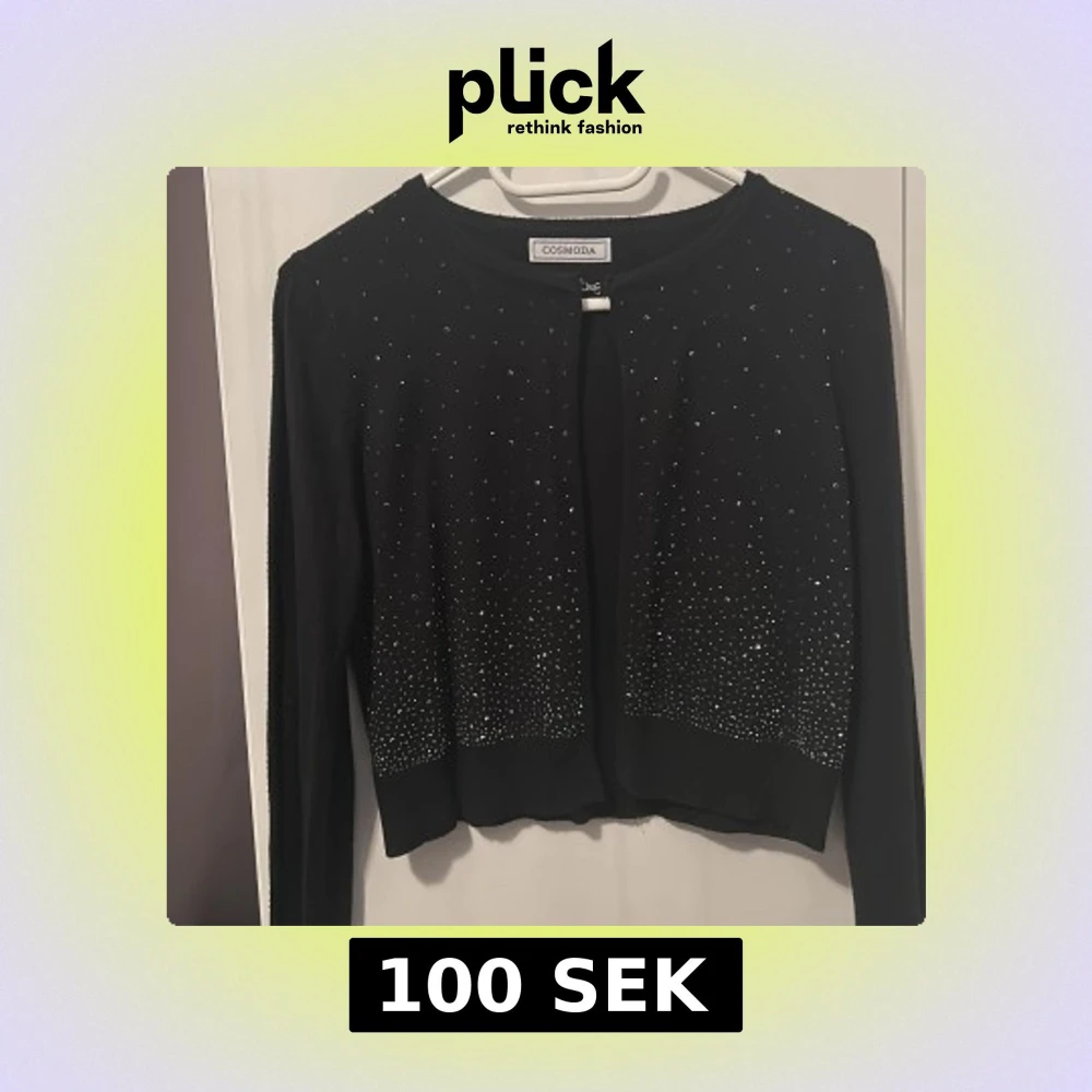 Svart kofta från Cosmoda med långa ärmar och glittriga paljettdetaljer framtill. Vissa av paljetter har blivit missfärgade men det syns inte väl, annars är den i bra skick! Köpt i Spanien 💕