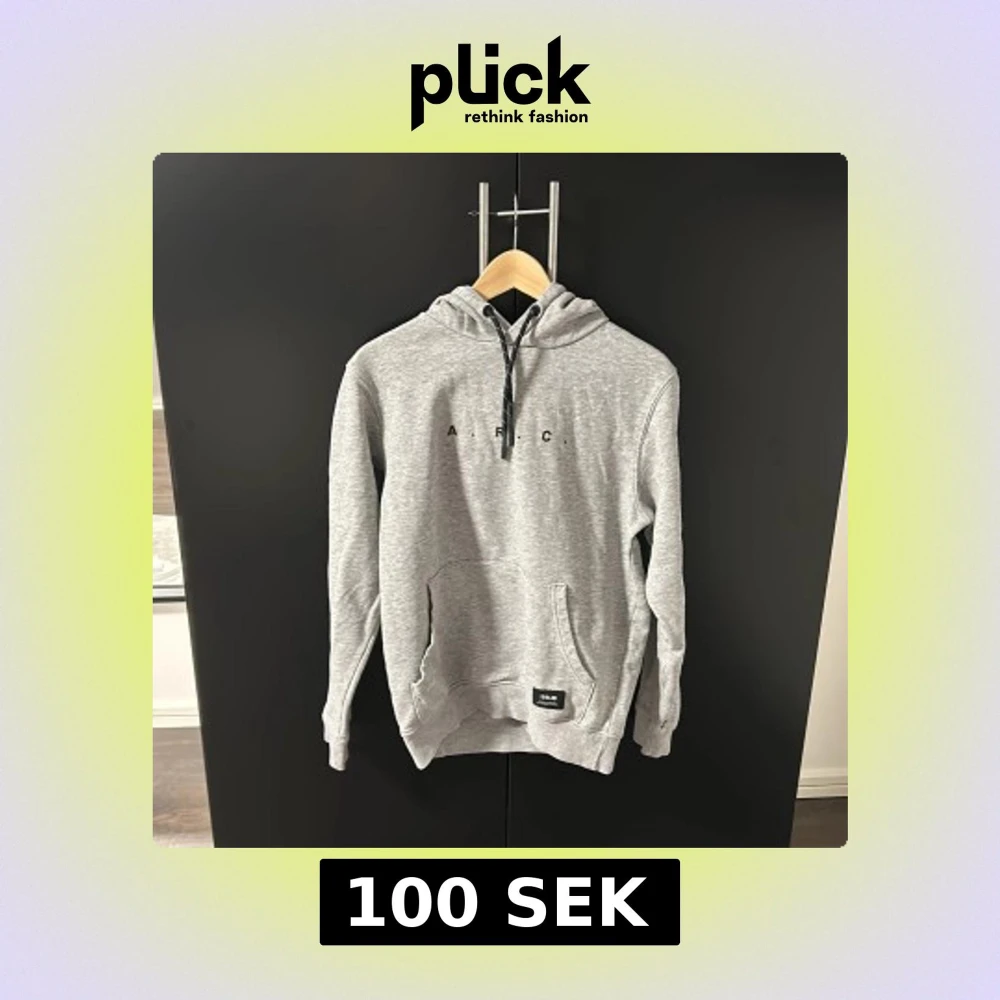 Säljer en stilren grå hoodie från !Solid med tryck 'A.R.C' på bröstet. Tröjan har en klassisk känguruficka och justerbar huva med snören. Perfekt för en avslappnad stil.