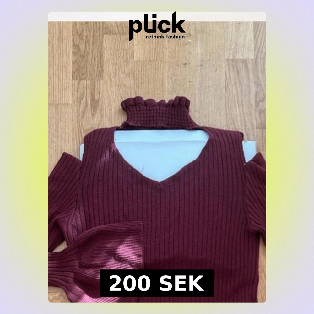 Vinröd ribbad polotröja med hög krage och v-ringning. Tröjan har långa ärmar med breda trumpetärmar som ger en unik look. Materialet är stretchigt och stickat, perfekt för höst och vinter. Snygg detalj med cut out vid axlarna.