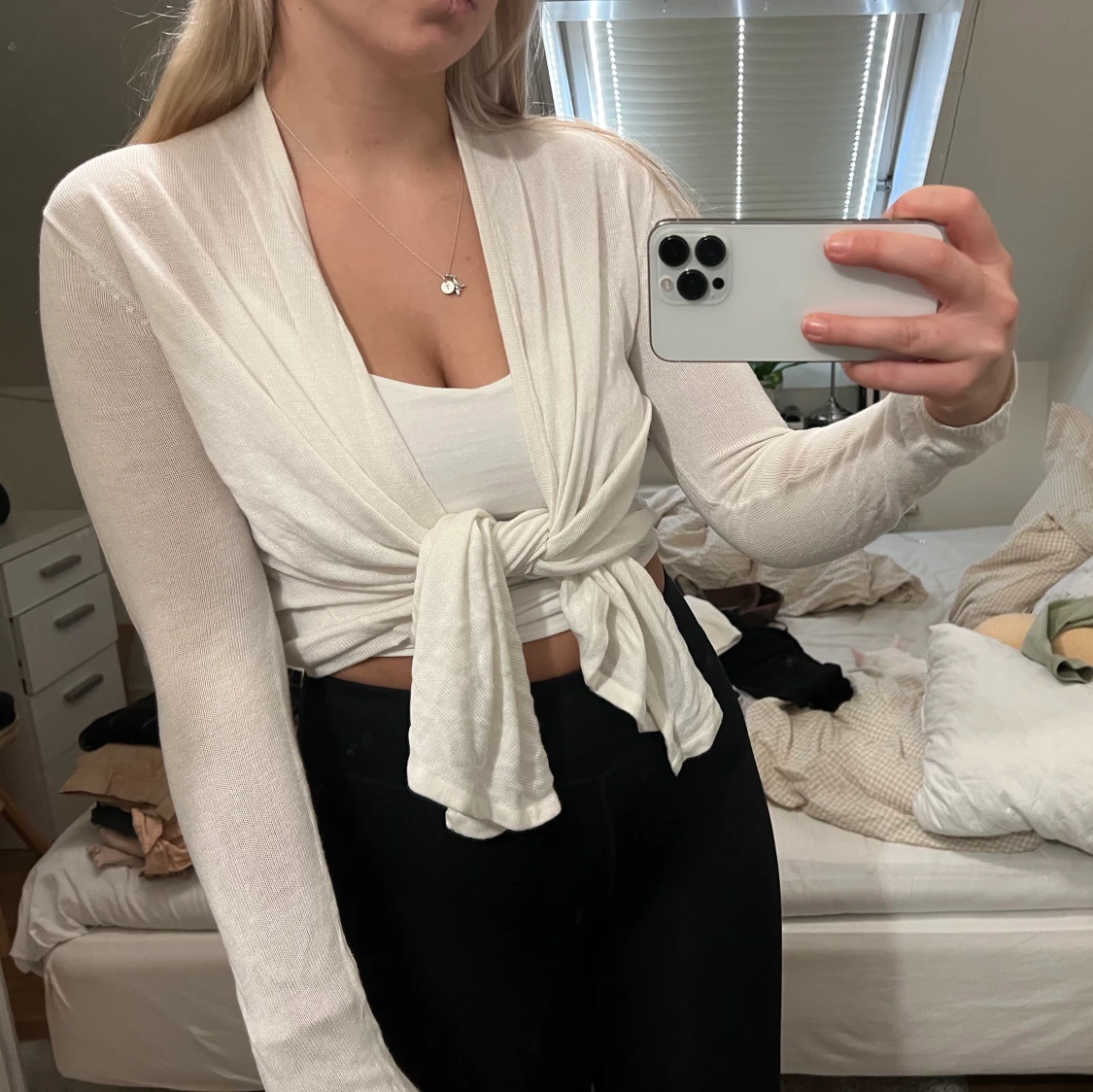 Vit finstickad kofta, går att ha som den är eller knyta runt midjan