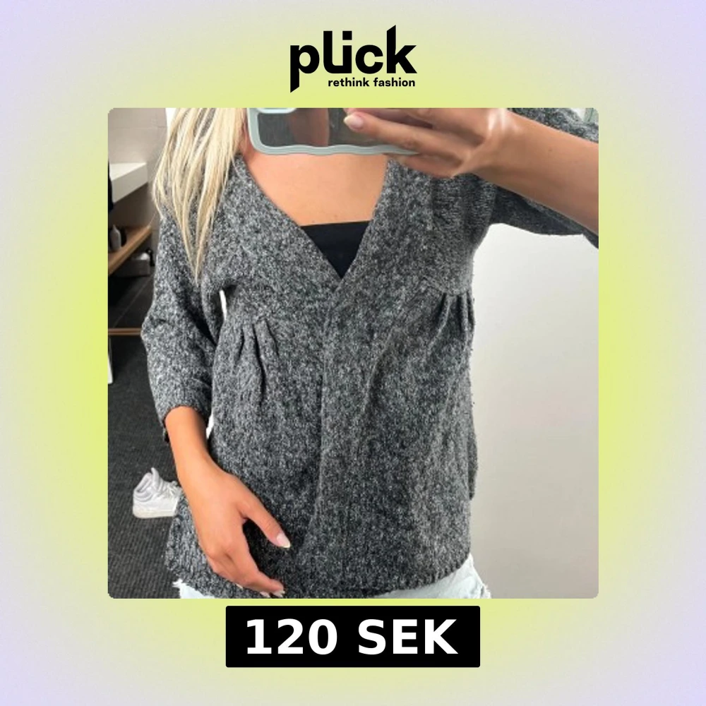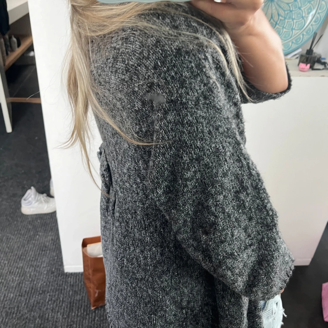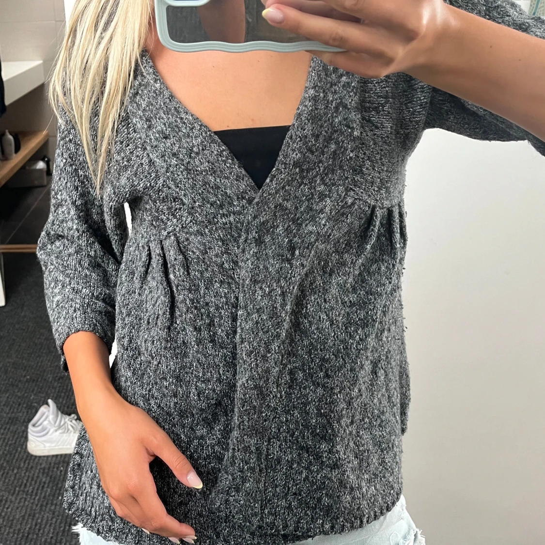 Mörkgrå stickad kofta med v-ringad hals och lätt rynkade detaljer vid bysten. Koftan har lång ärm och en loose passform, perfekt att slänga över en topp. Passar dig som gillar en avslappnad och stilren look.