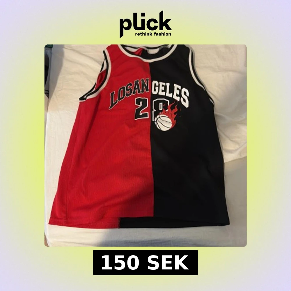 Säljer ett basketlinne i rött och svart med texten 'Los Angeles' och siffran 28 framtill. Linnet har en cool basketboll med eld-detalj och vita kontrastkanter vid hals och ärmhål. Perfekt för träning eller streetstyle.
